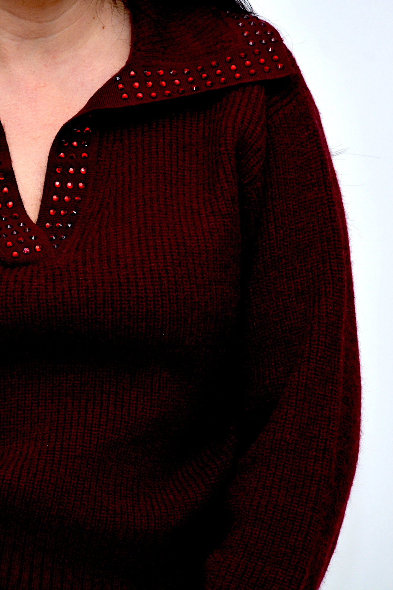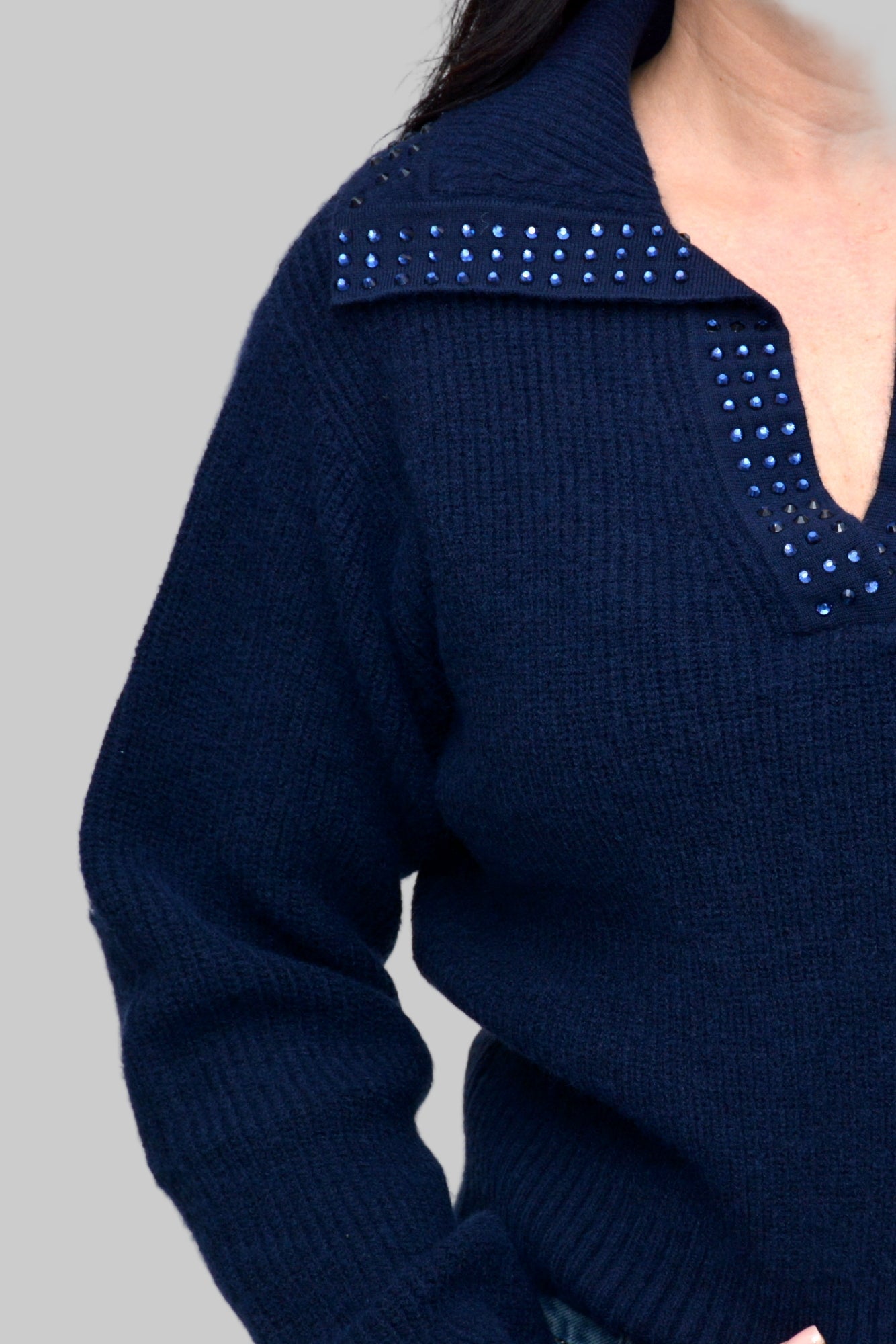 Pulover tricotat moale, cu croi lejer și detalii rafinate de aplicații strălucitoare în partea superioara, un plus pentru o ținută chic. O piesă elegantă și confortabilă, perfectă pentru a adăuga o notă sofisticată ținută de zi cu zi.