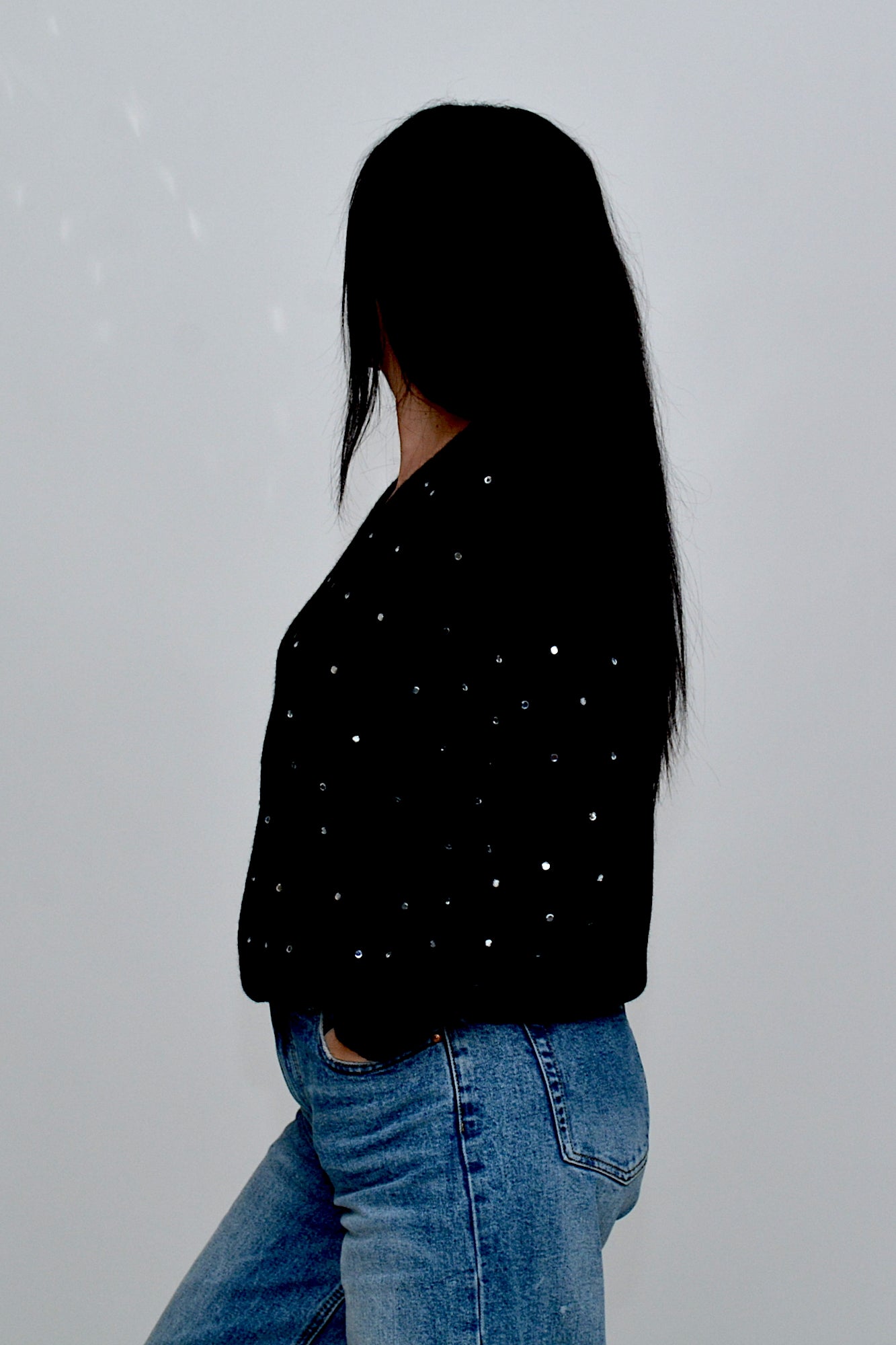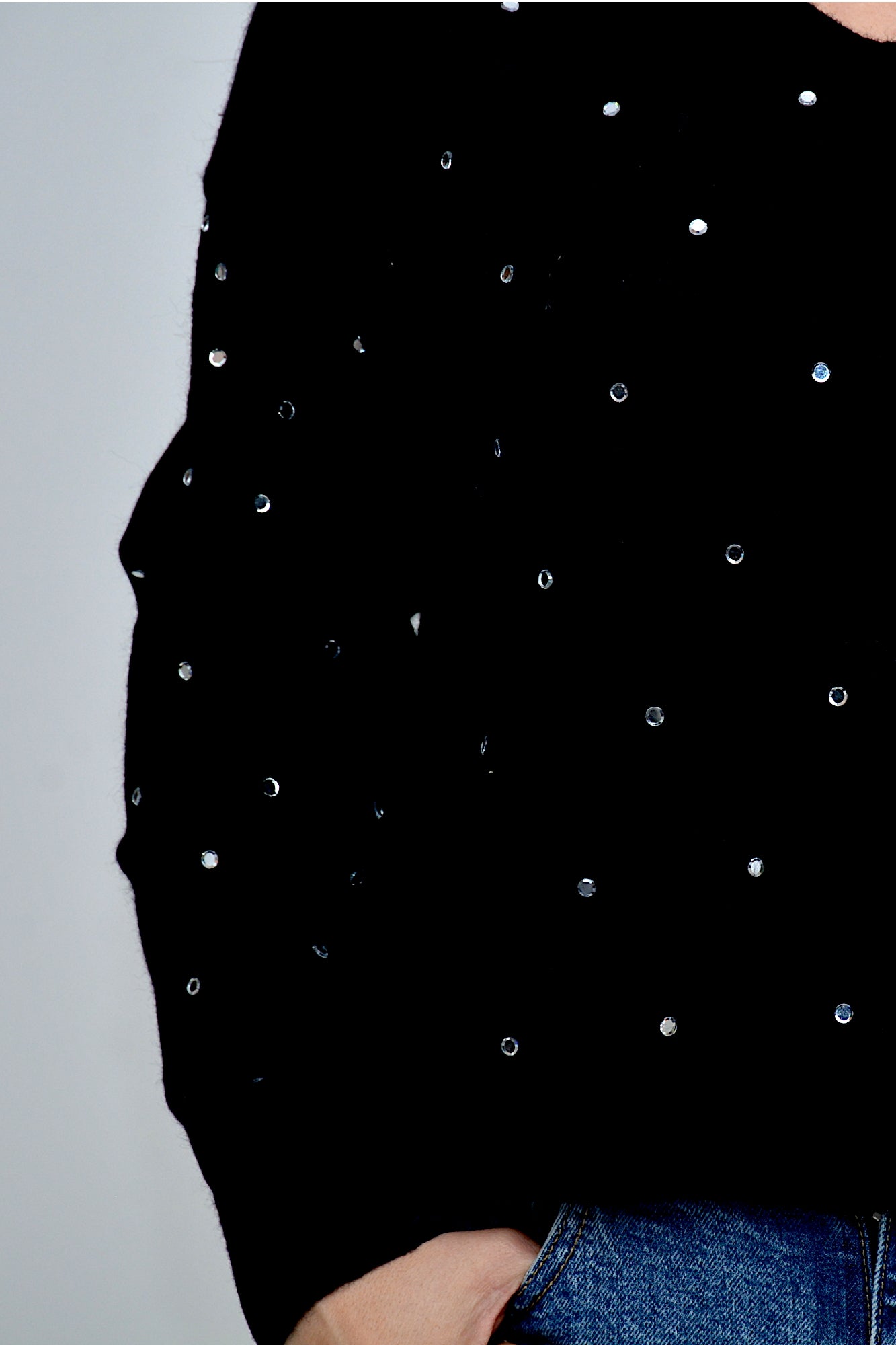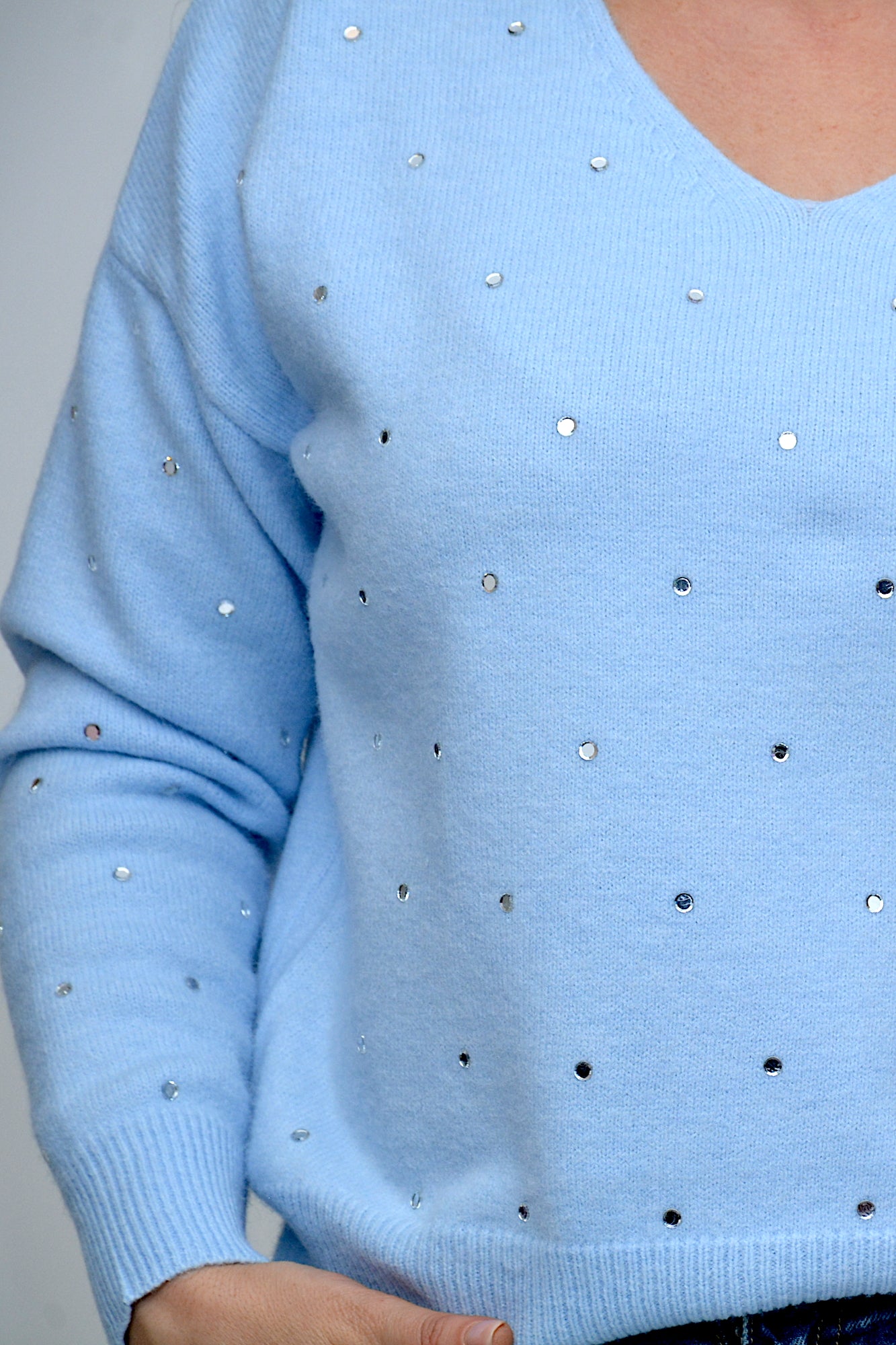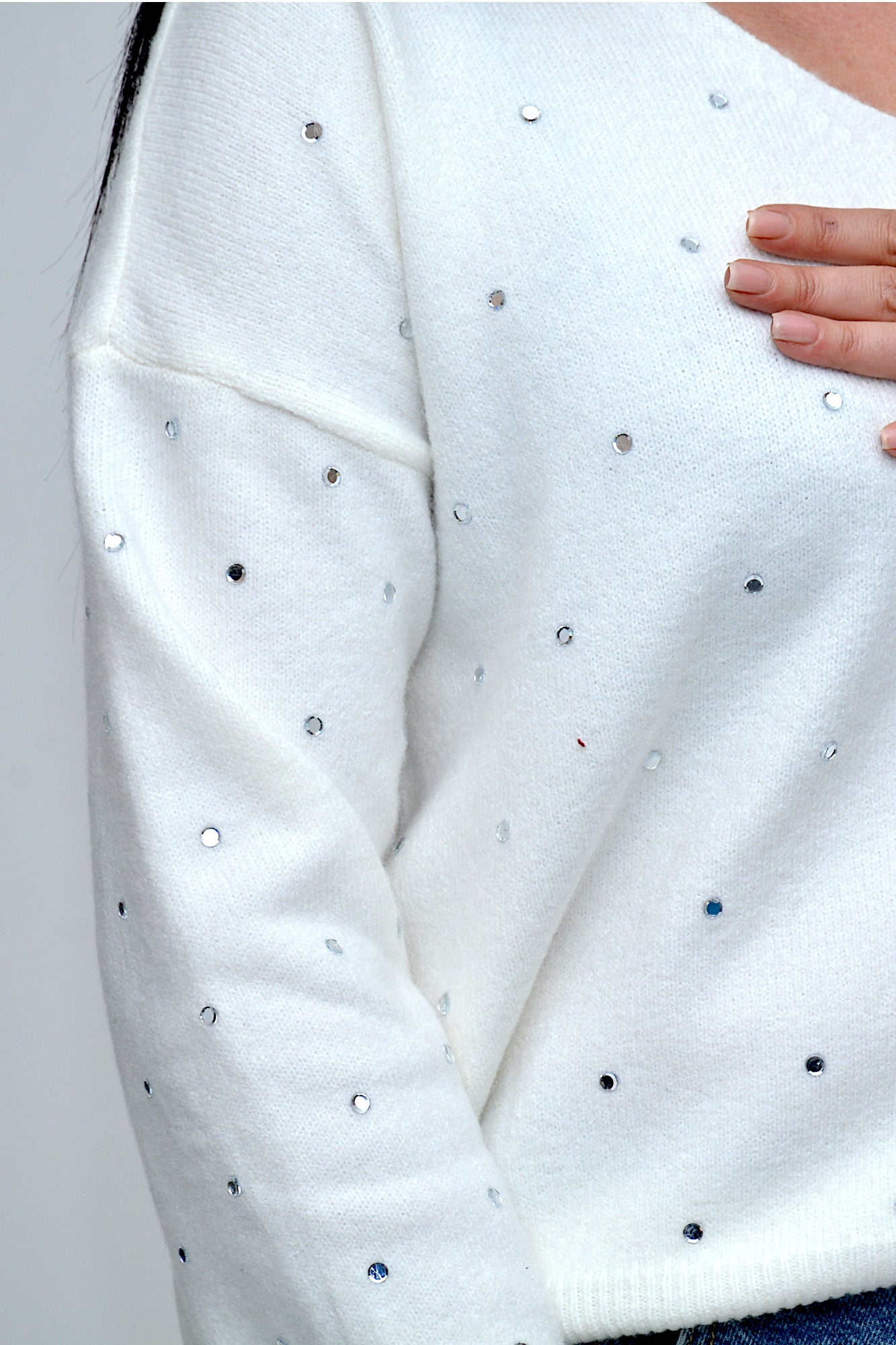 Pulover tricotat moale, cu croi lejer și detalii rafinate de aplicații strălucitoare , un plus pentru o ținută chic .O piesă elegantă și confortabilă, perfectă pentru a adăuga o notă sofisticată ținută de zi cu zi.