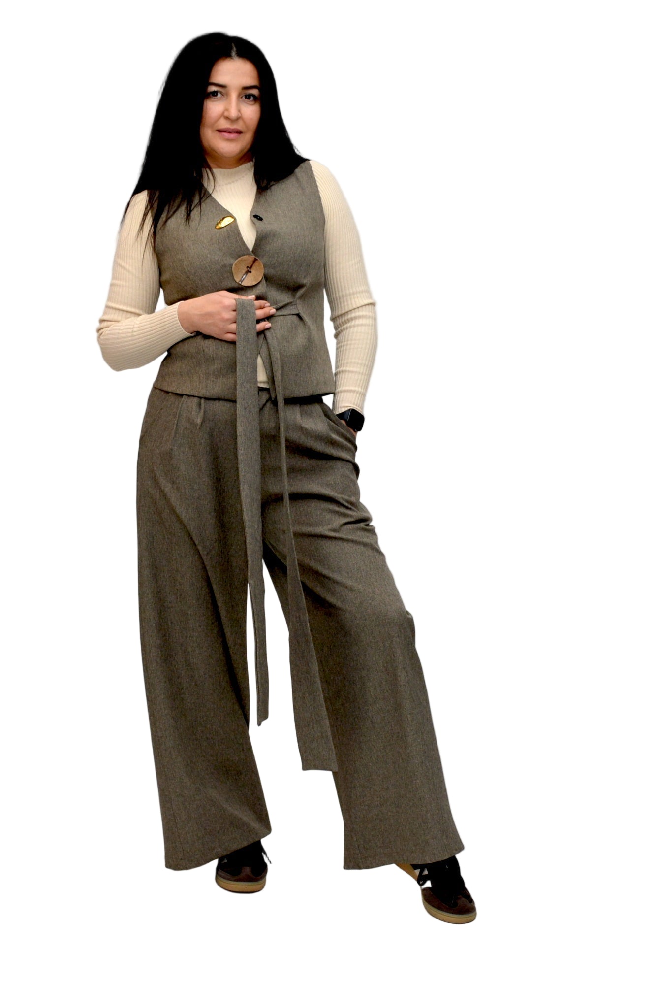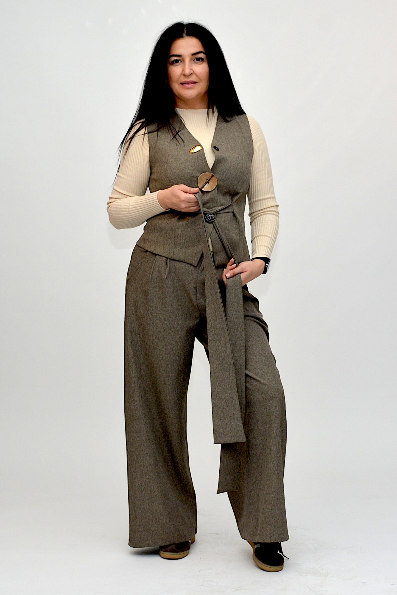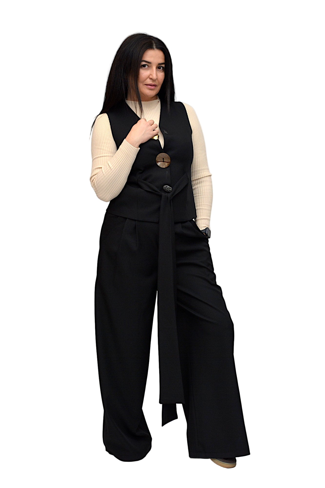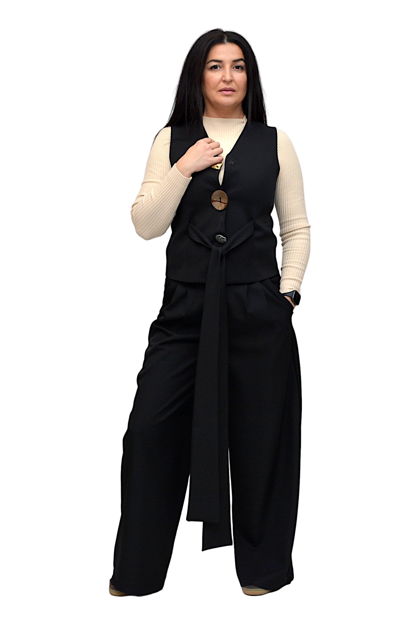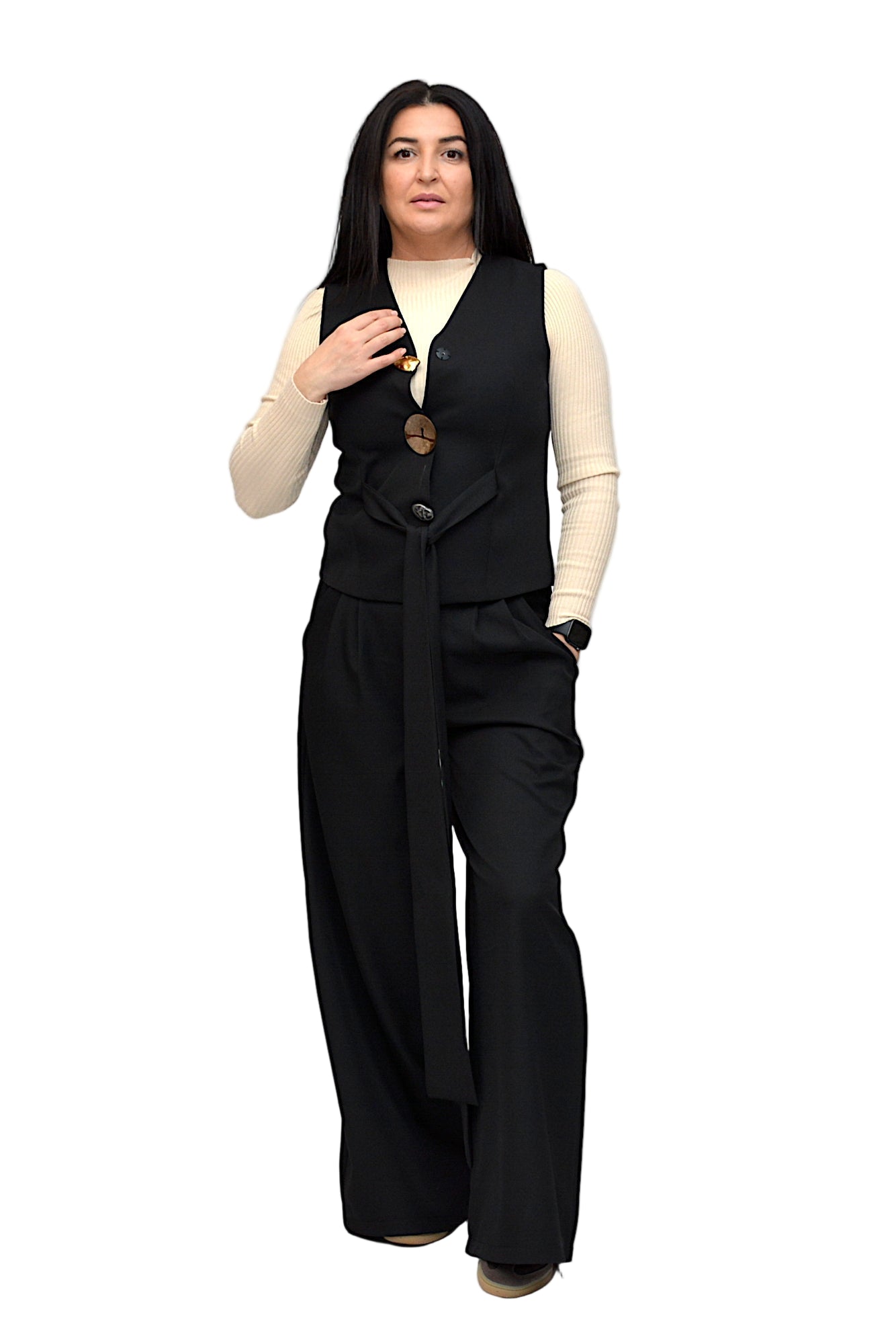 Compleu elegant din stofă fină, format din vestă cambrată cu închidere decorativă și pantaloni evazați cu talie înaltă. Croiala modernă și materialul de calitate oferă un look rafinat și confortabil, perfect atât pentru birou, cât și pentru evenimente casual-chic.
