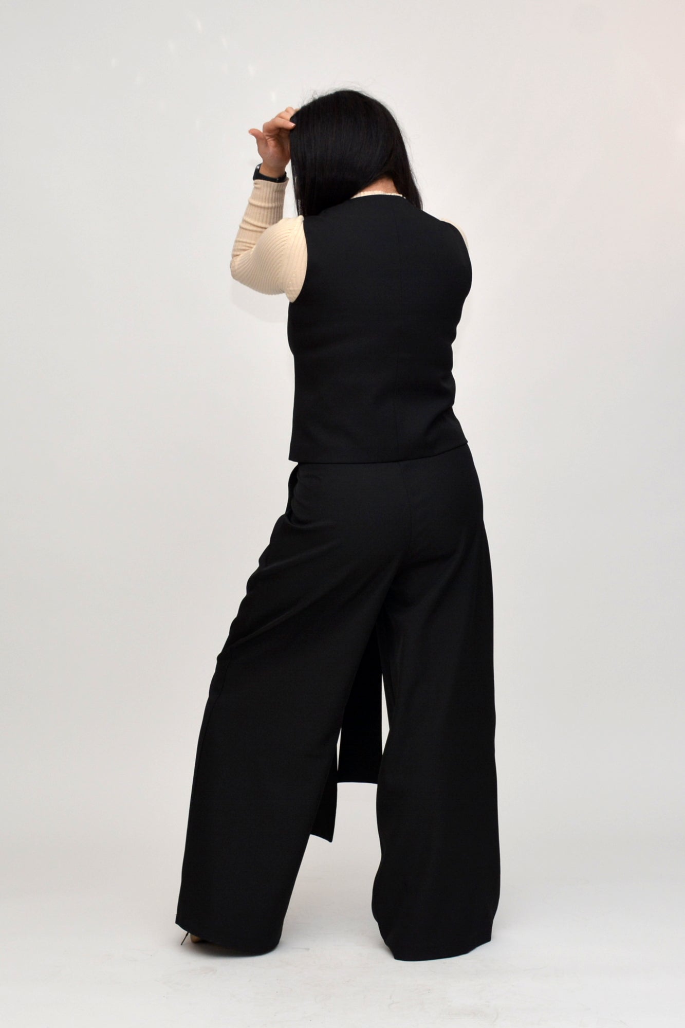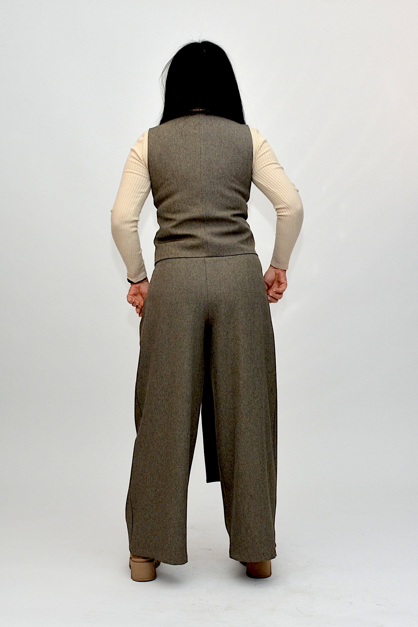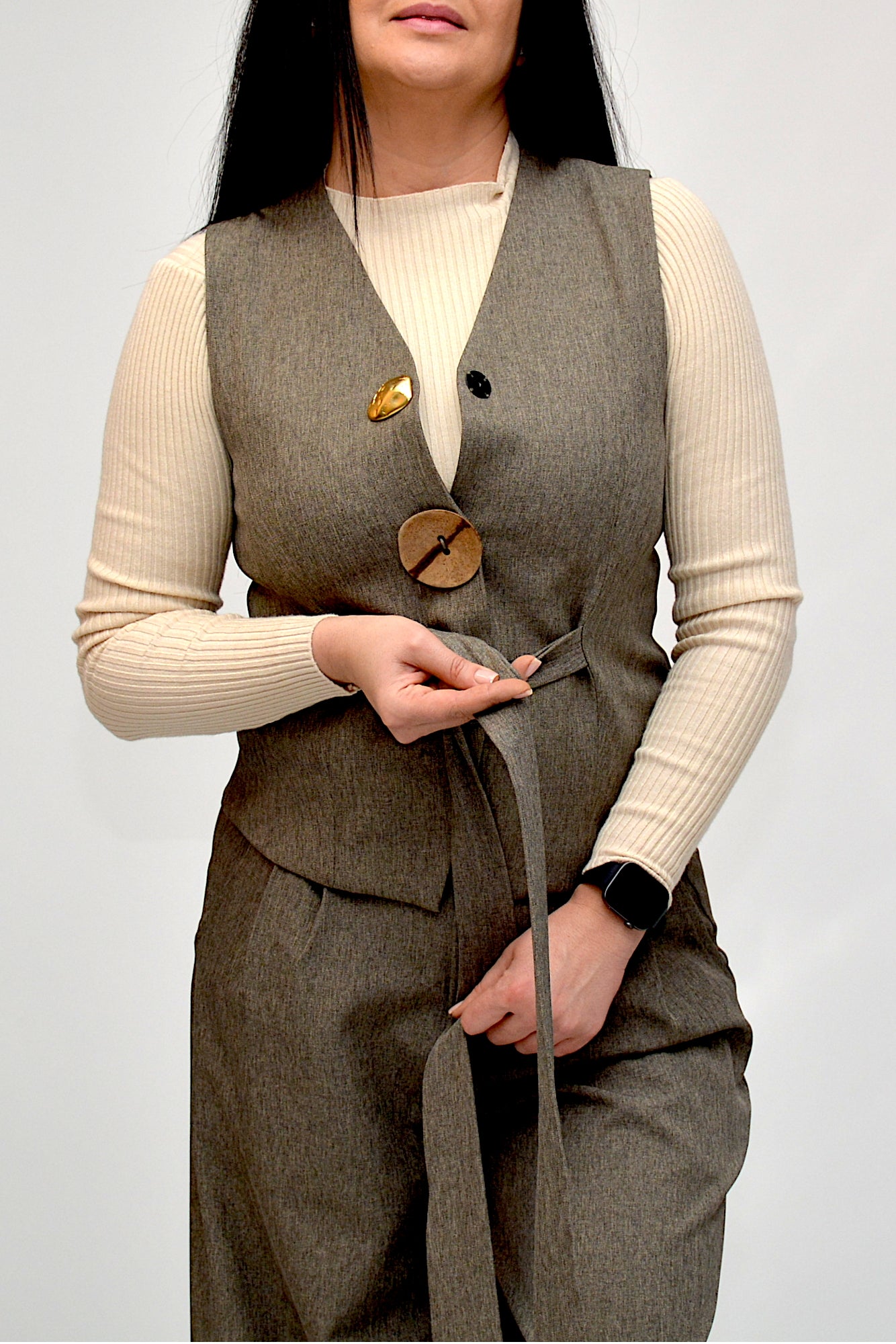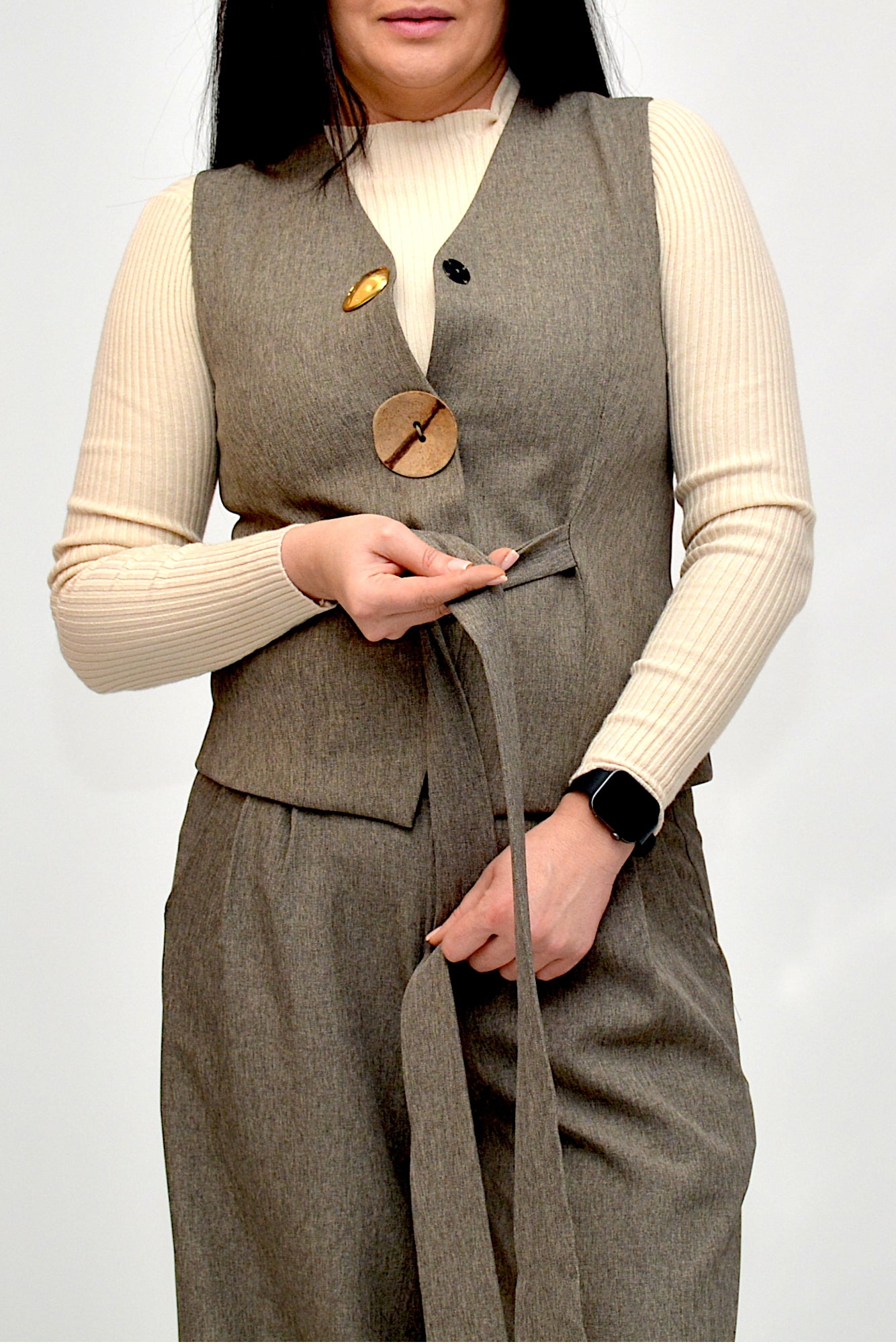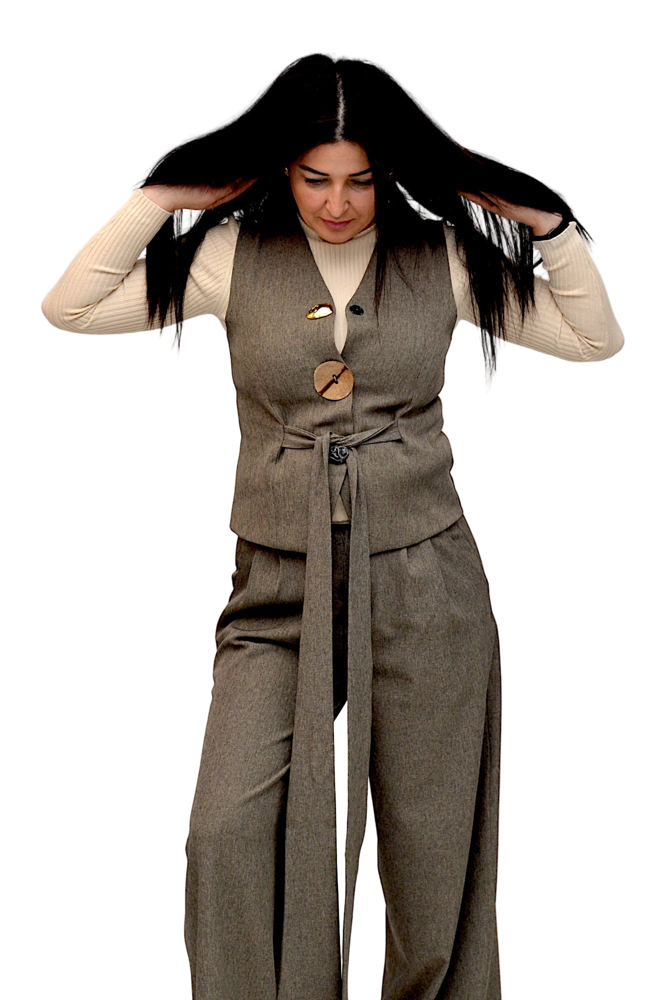 Compleu elegant din stofă fină, format din vestă cambrată cu închidere decorativă și pantaloni evazați cu talie înaltă. Croiala modernă și materialul de calitate oferă un look rafinat și confortabil, perfect atât pentru birou, cât și pentru evenimente casual-chic.