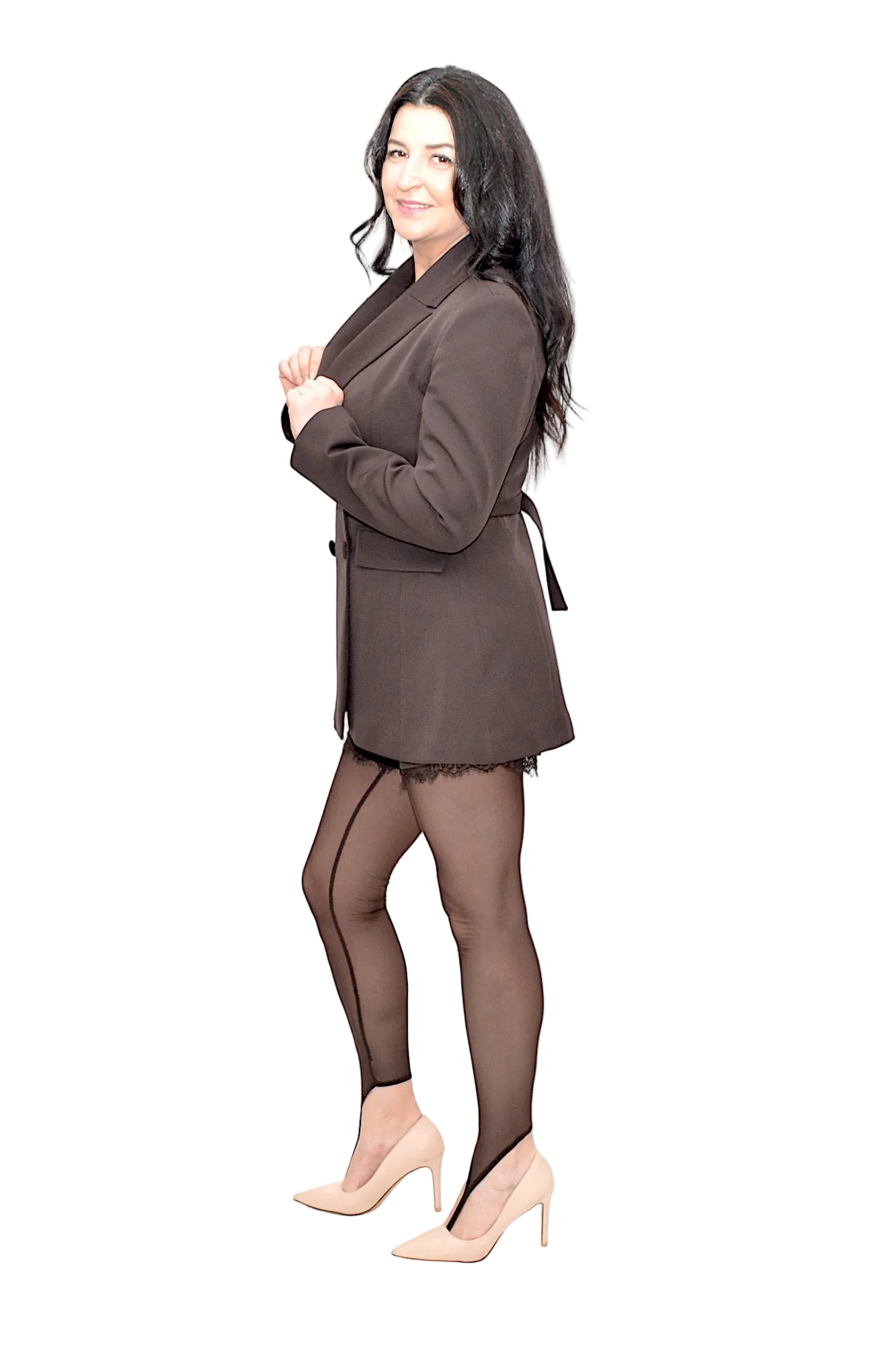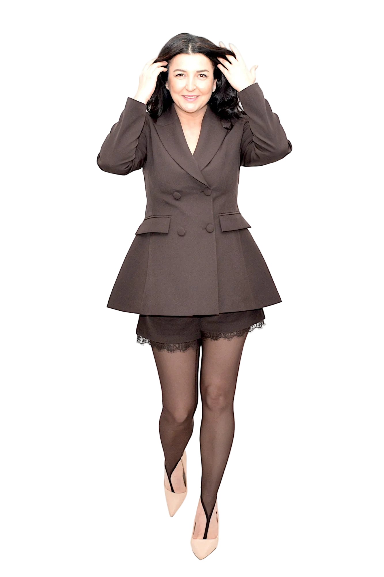 Compleu elegant din 3 piese, format din sacou cambrat, pantaloni scurți cu inserție delicată de dantelă și dresuri asortate. Designul sofisticat și croiul feminin îl fac ideal pentru apariții rafinate, evenimente speciale sau ținute stylish cu atitudine.
