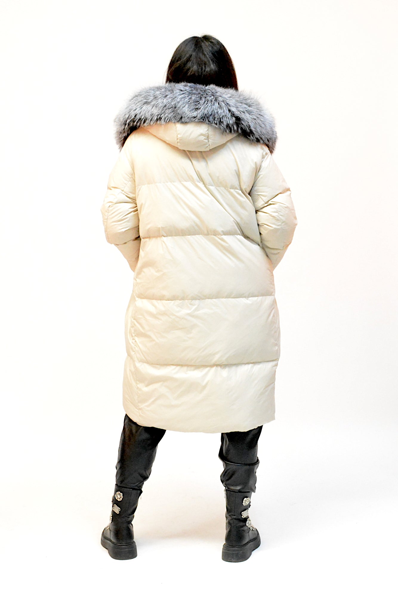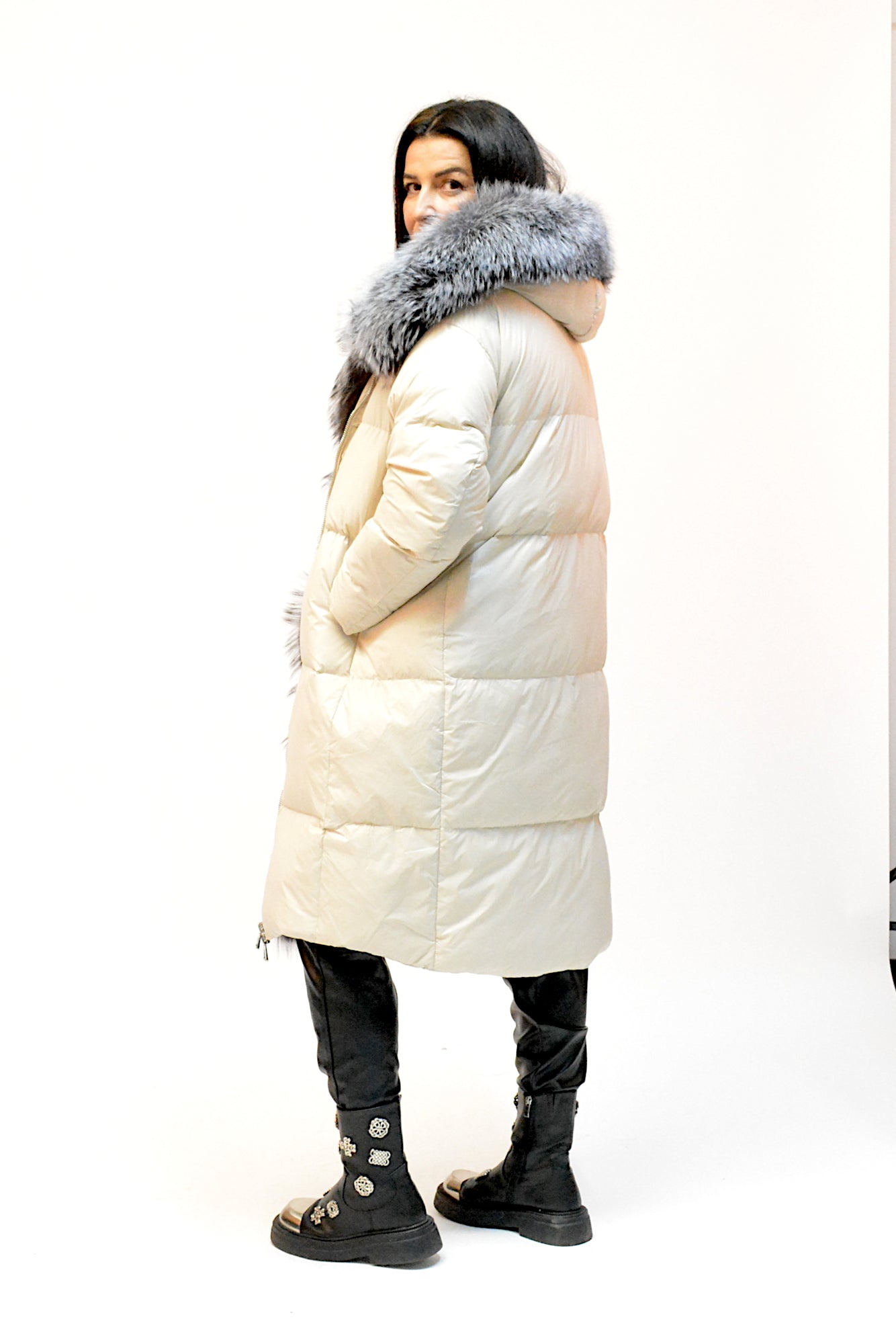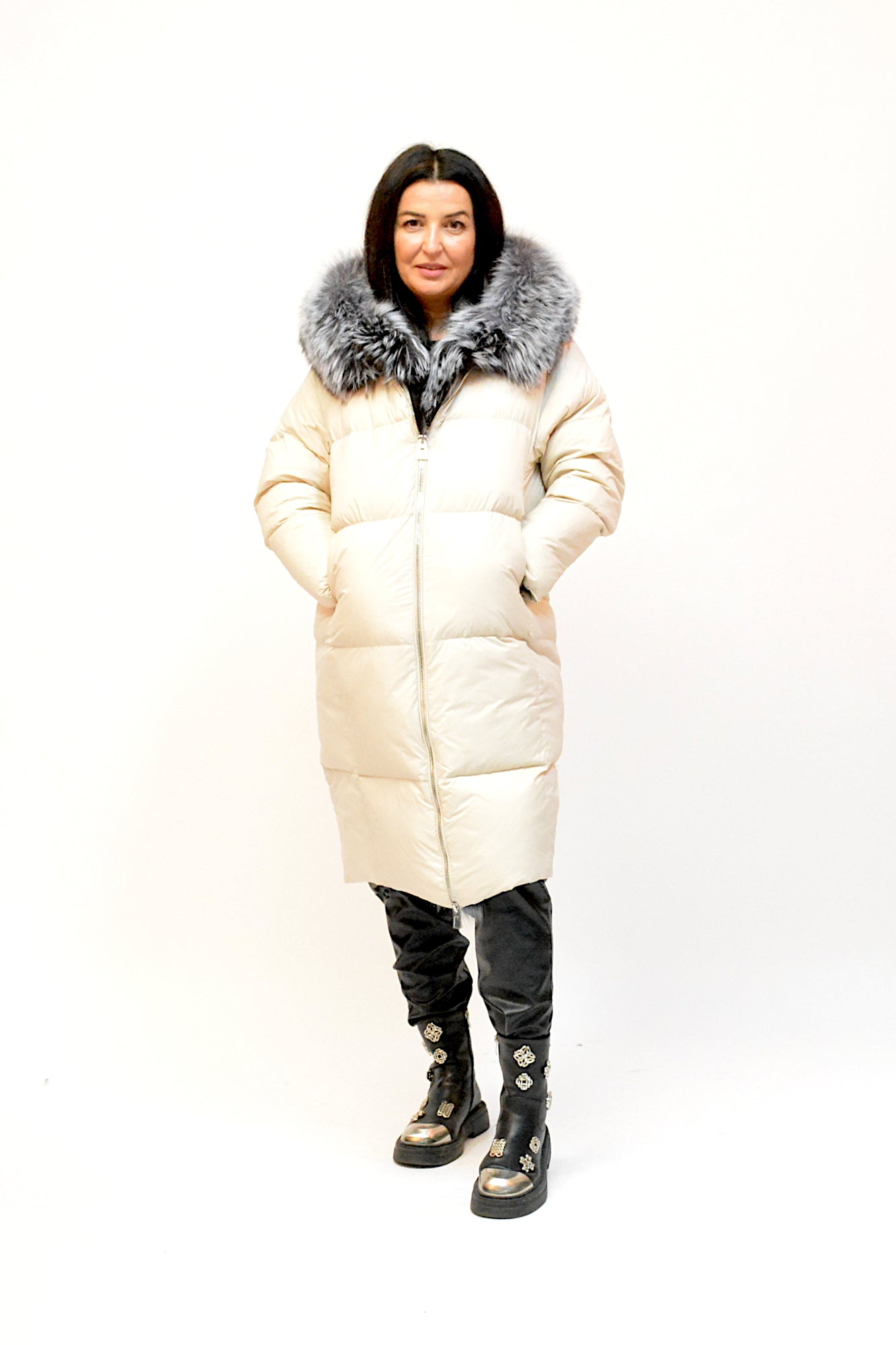 Geacă lungă cu puf de gâscă, extrem de călduroasă și ușoară, accesorizată cu blană naturală detașabilă ce conturează elegant linia de închidere și gluga. Un model rafinat și practic, ideal pentru zilele reci de iarnă.