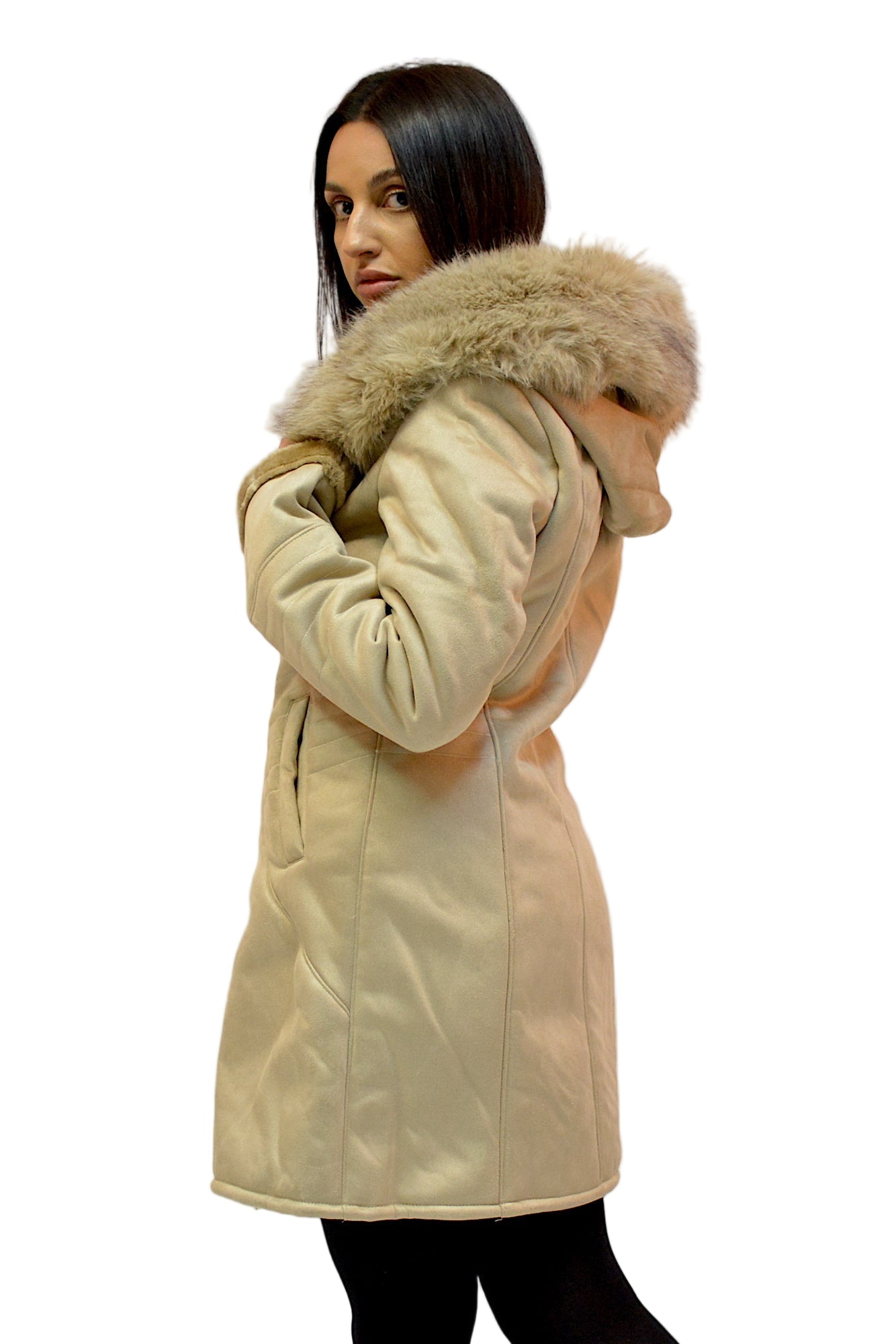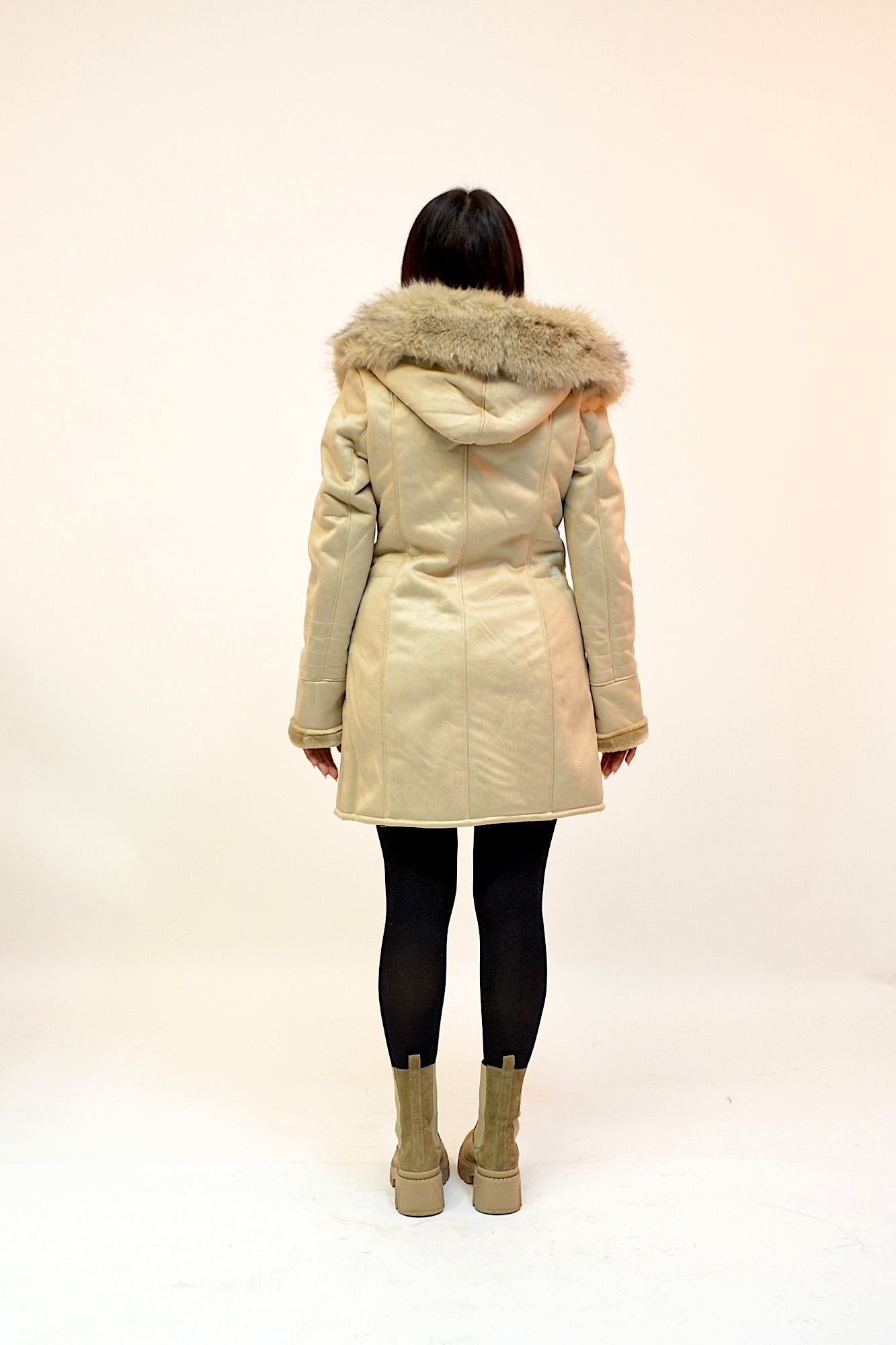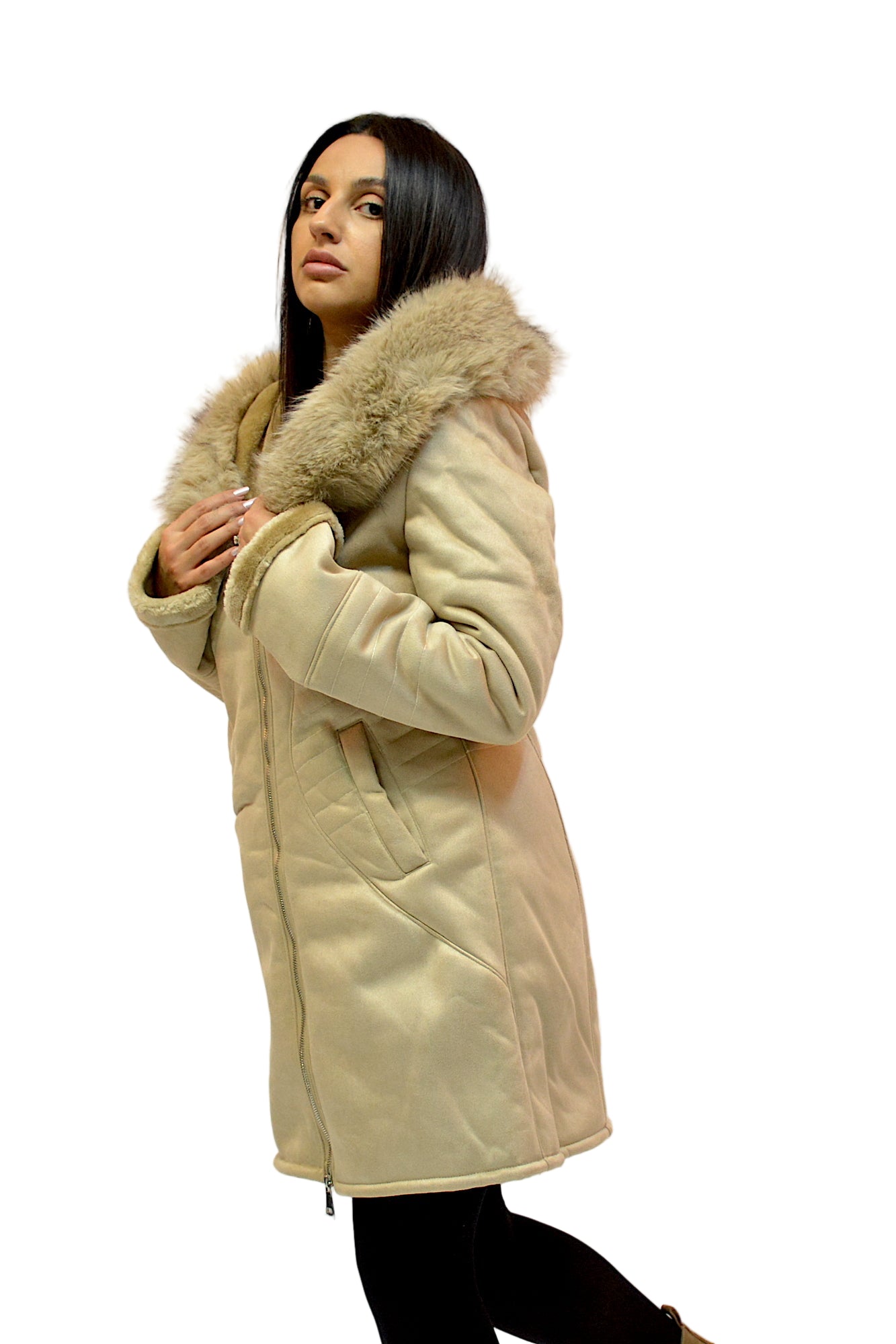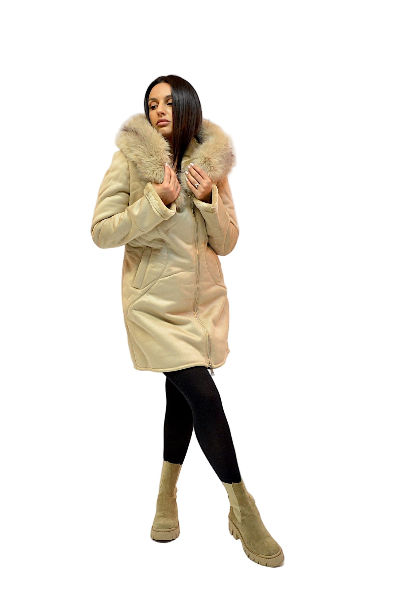 Jacheta tip cojoc cu gluga si blanita eco,buzunare laterale,cambrata pe talie ,sistem de inchidere cu fermoar,extrem de comfortabila si calduroasa in sezonul rece.
