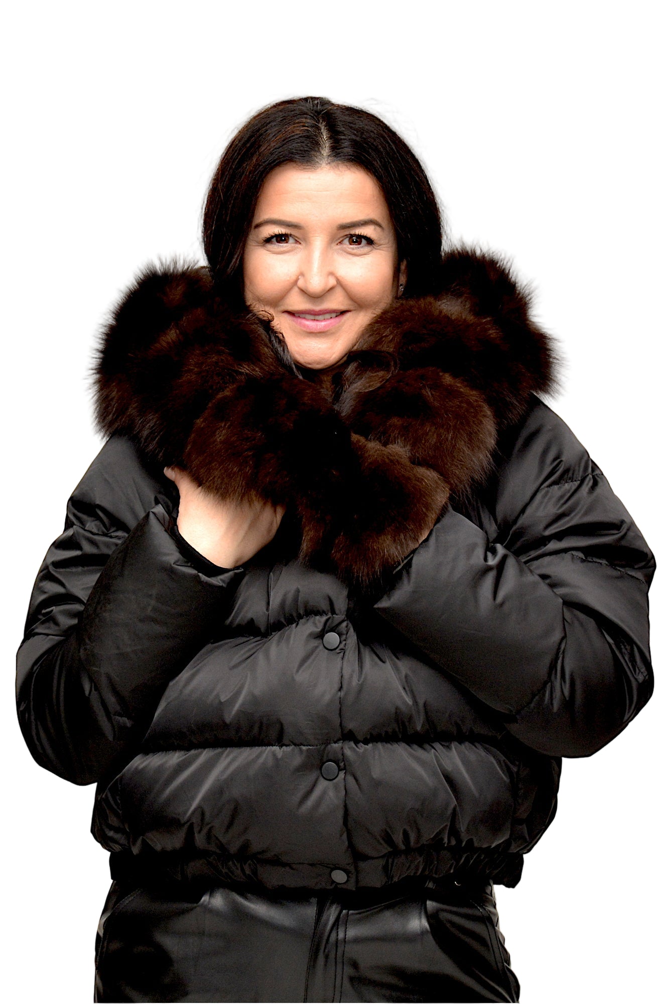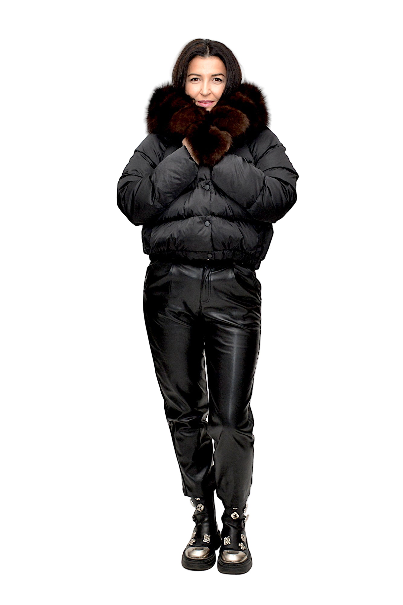 Geacă cu puf de gâșcă, extrem de călduroasa și ușoară, accesorizată cu blană naturală de vulpe detașabilă ca sistem de inchidere cu capse .Un model rafinat și practic, ideal pentru zilele reci de iarnă.
