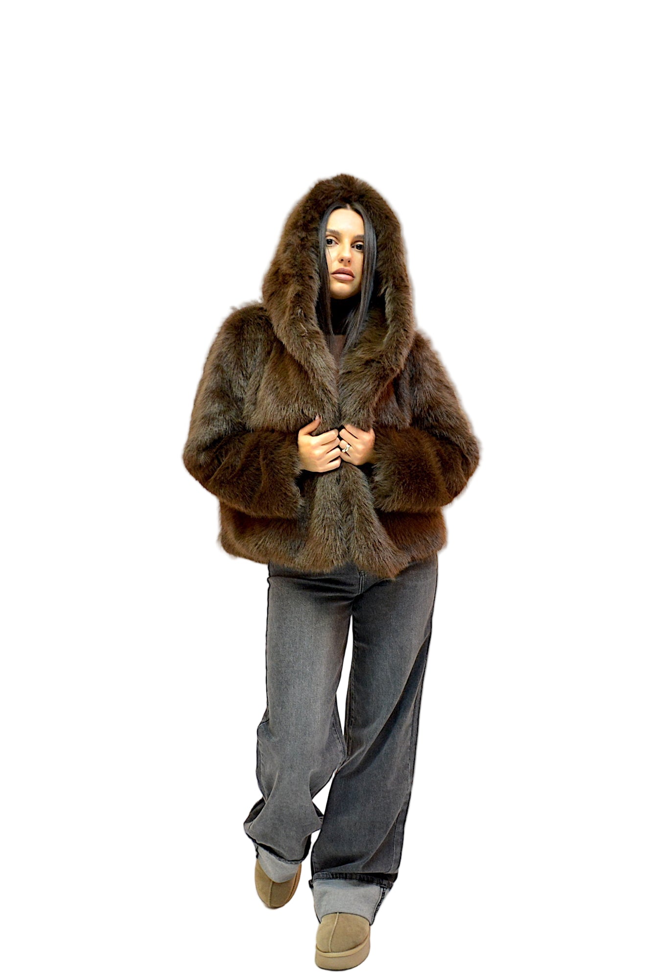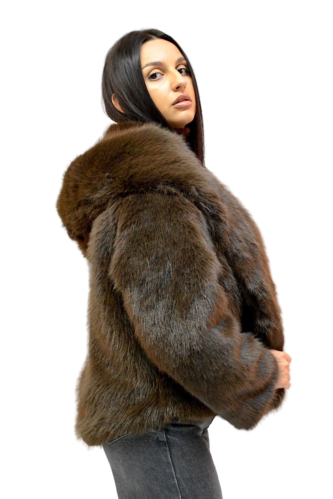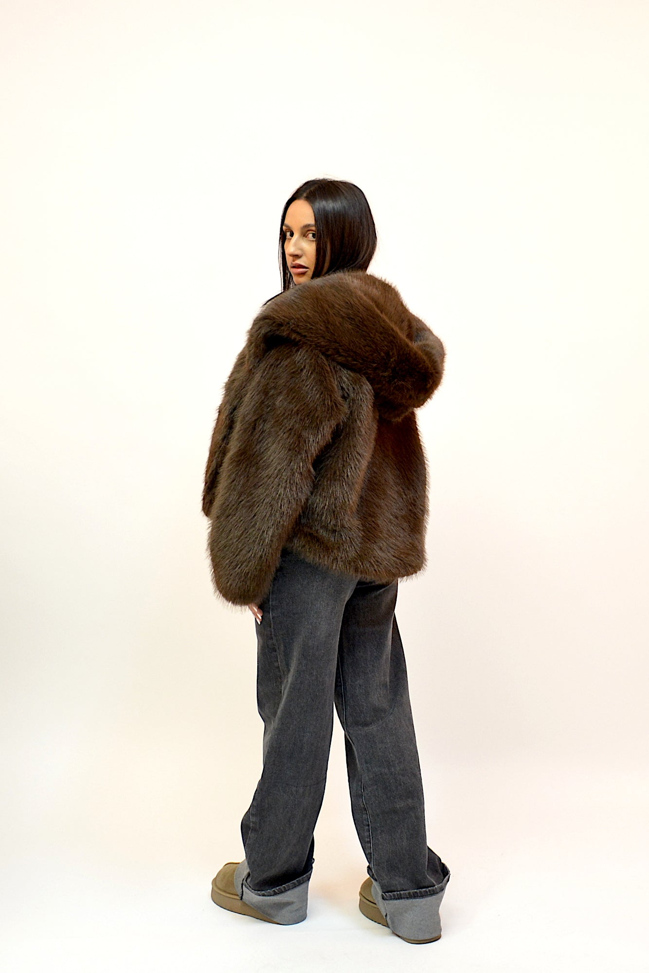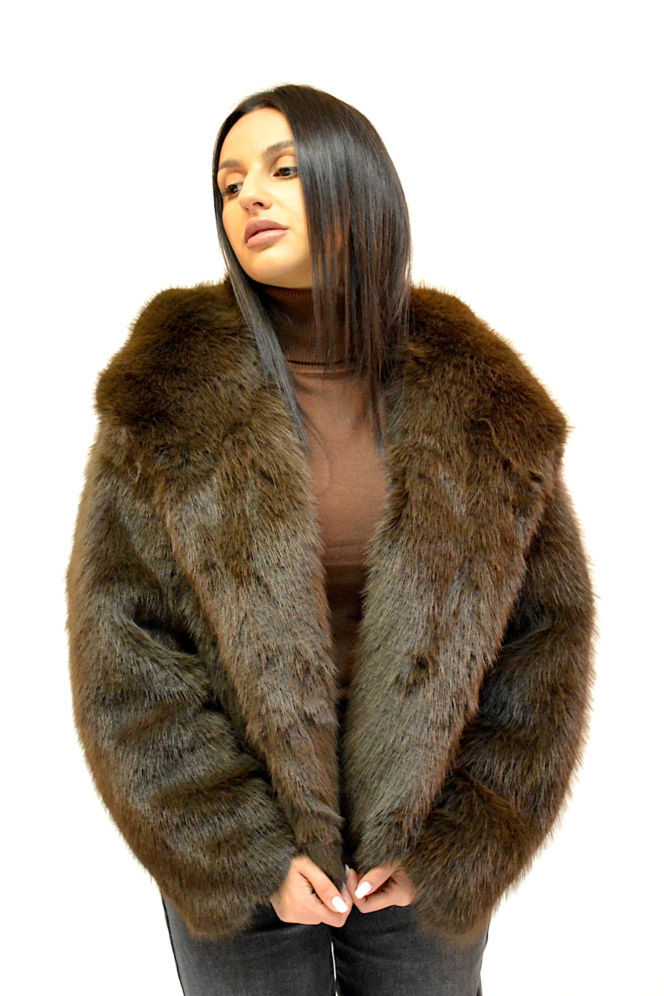 Blăniță ecologică maro, cu textură pufoasă, ideală pentru un look modern și sofisticat,sistem de inchidere cu mos si baba.O piesă statement care adaugă volumul și stil oricărei ținute de toamnă-iarnă.
