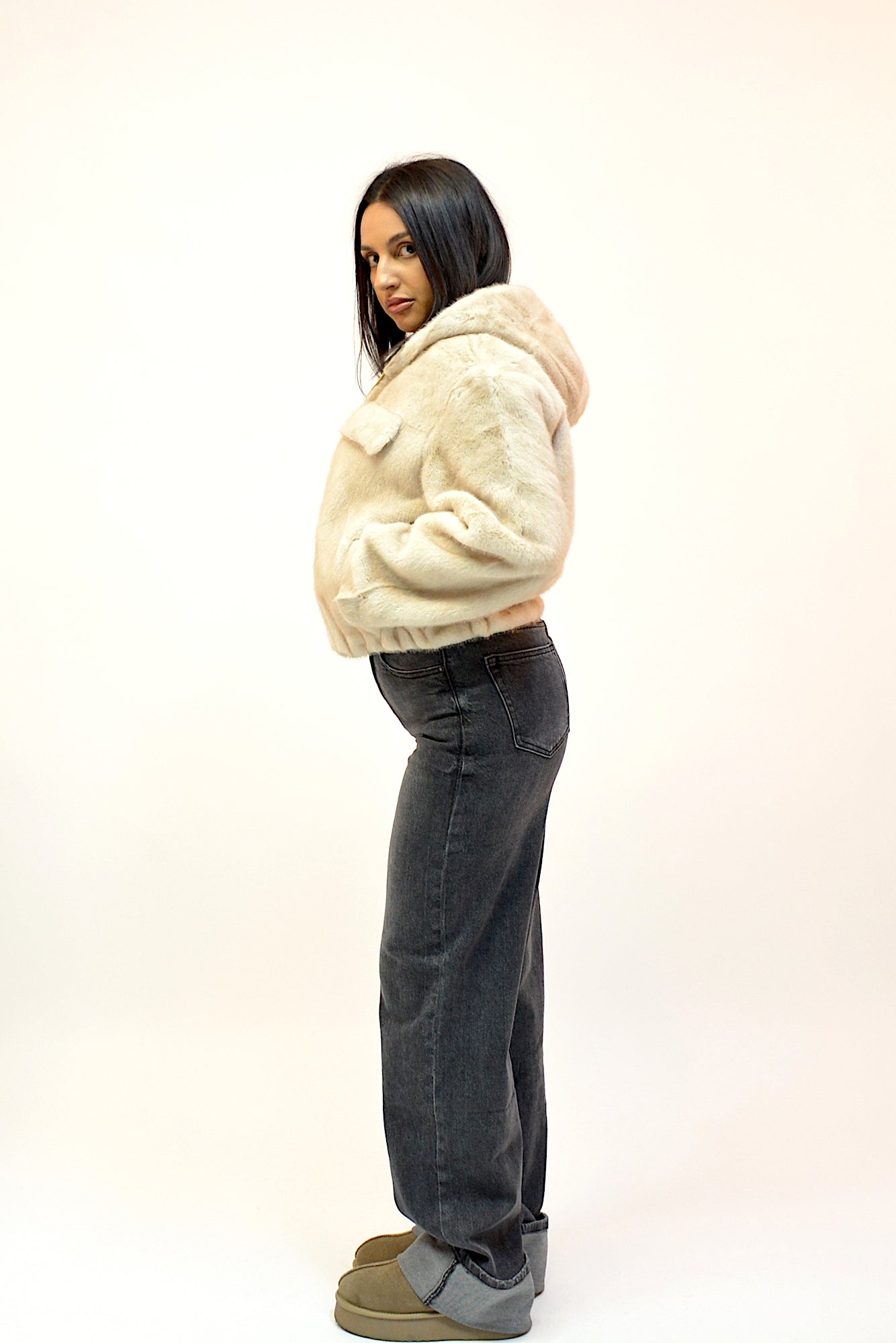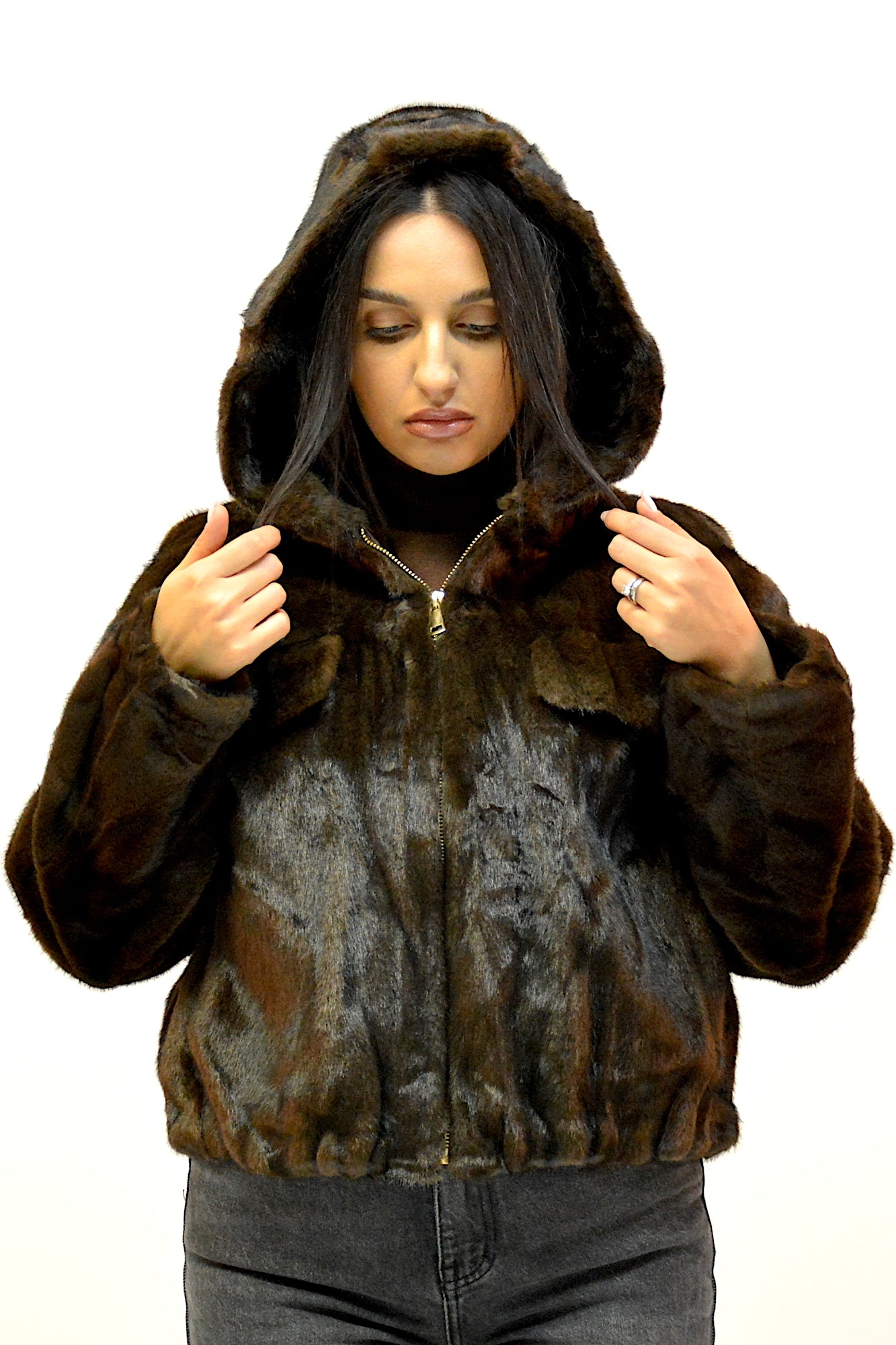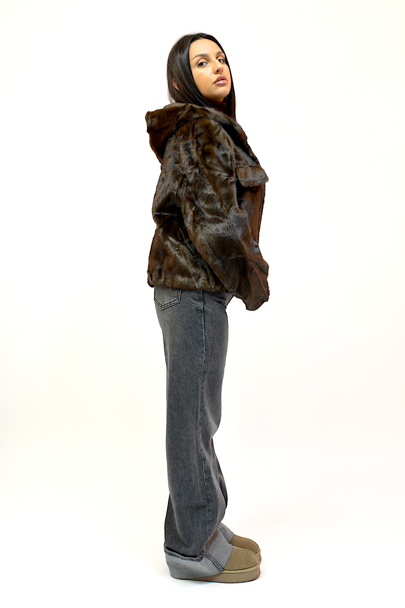 Jacheta din blana ecologica,foarte fina la atingere,buzunare laterale,maneci lungi si gluga ,sistem de inchidere cu fermoar ,practica si extrem de confortabila in sezonul rece
