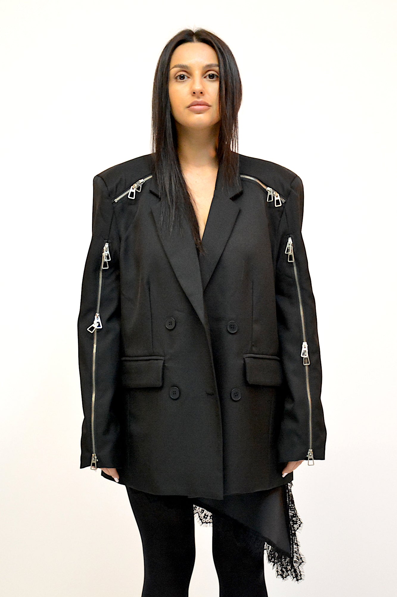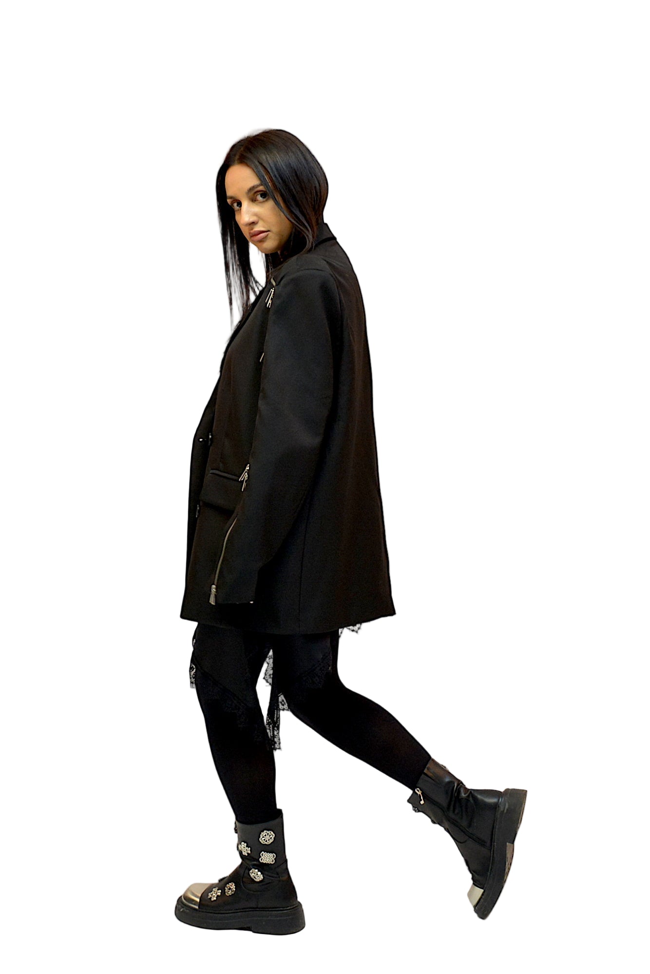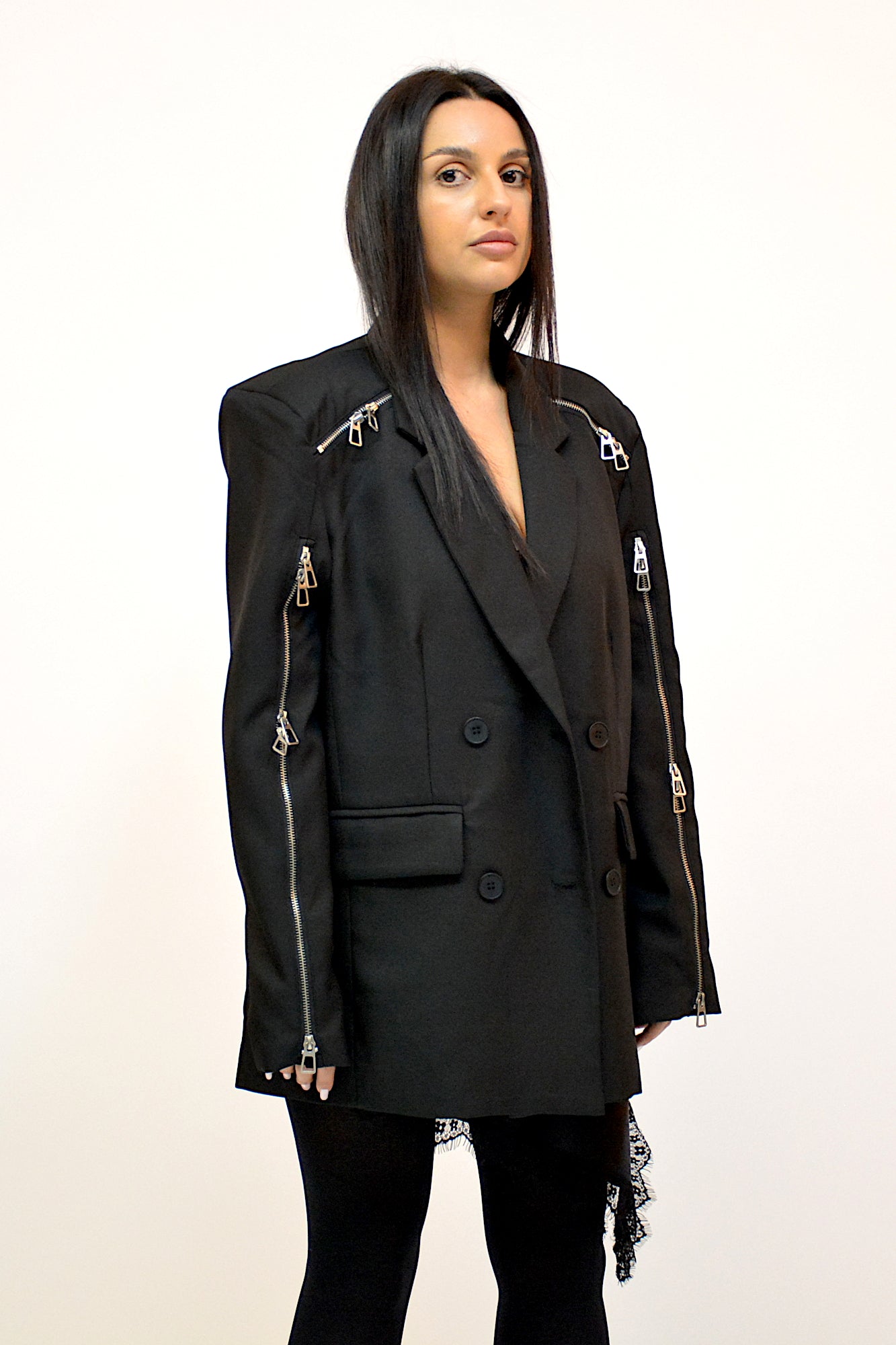 Sacou oversized,pentru tinute casual ,sistem de inchidere cu nasturi accesorizat cu fermoare intr-un mod sic pentru tinute stylish all sezon.