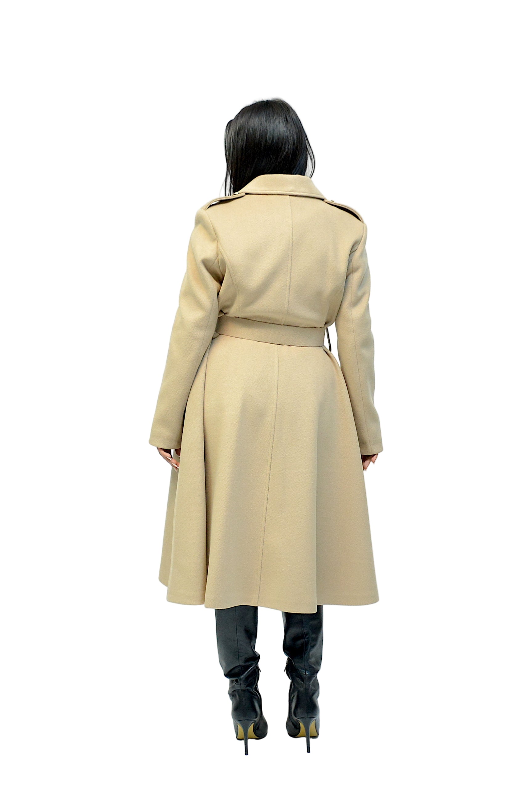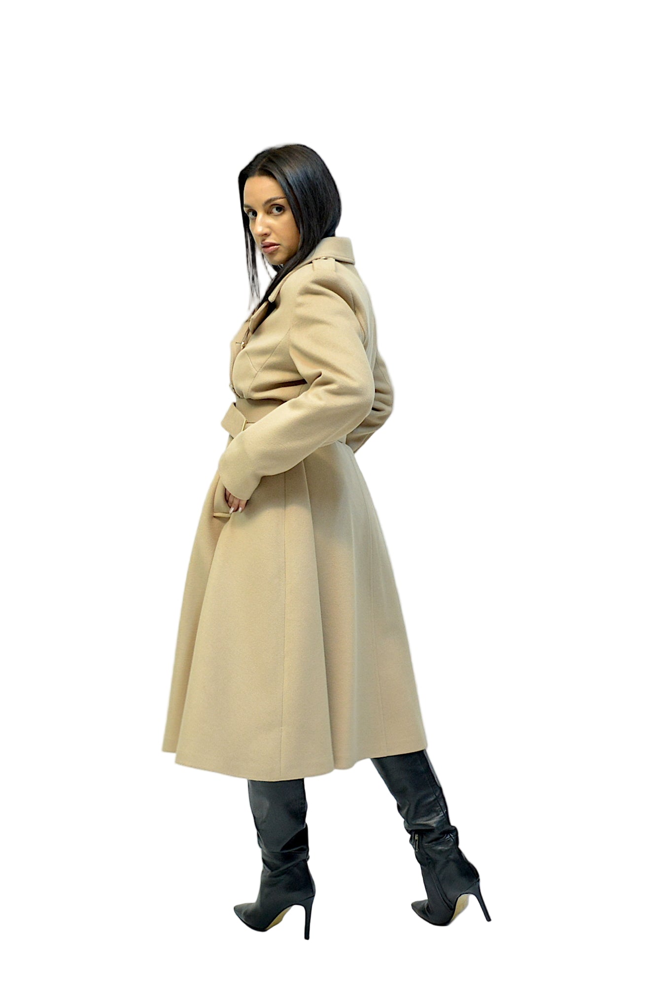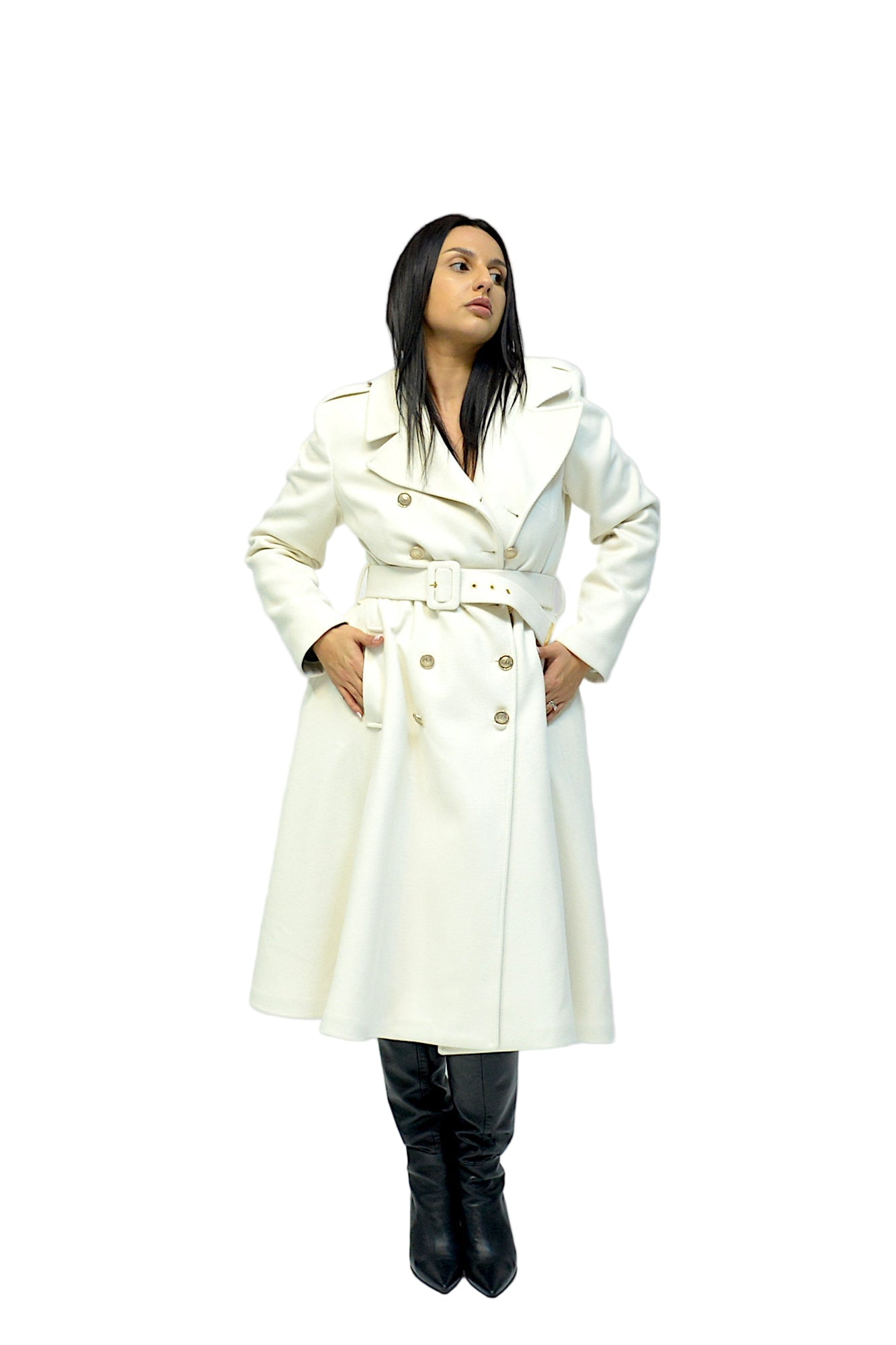 Palton cambrat cu curea, buzunare și nasturi aurii – eleganță și rafinament în fiecare detaliu.