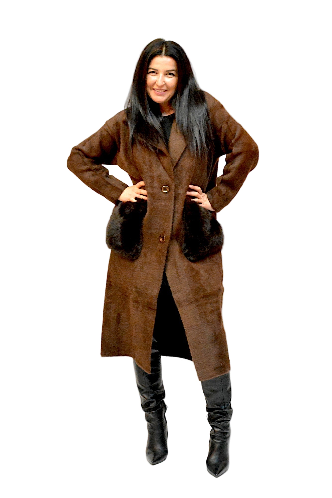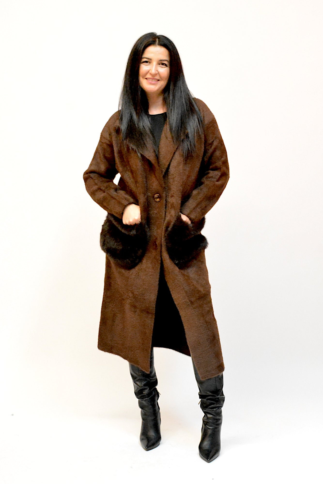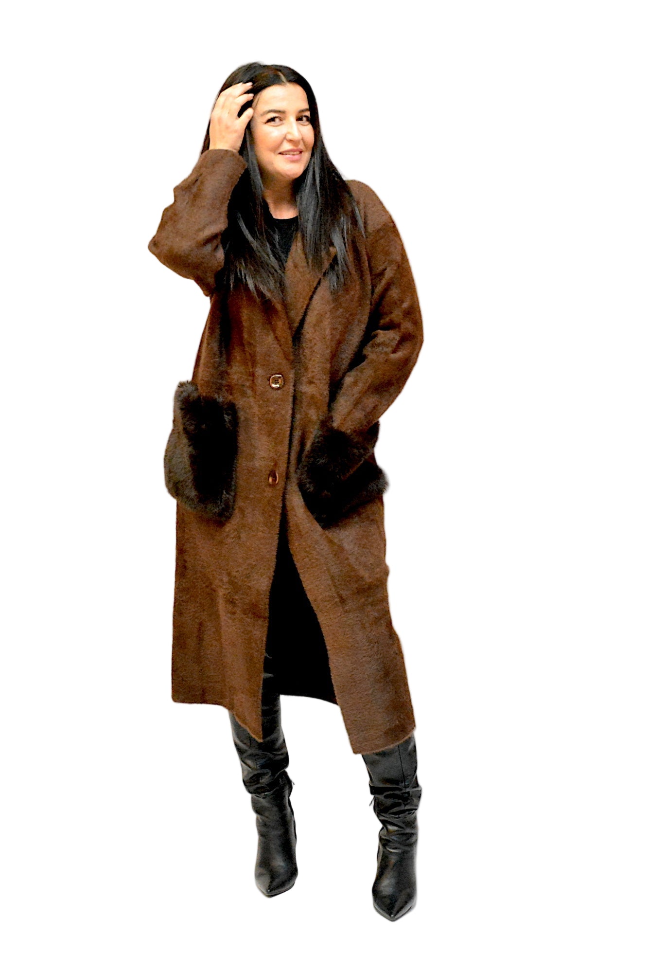 Palton lung, cu croi oversize și închidere cu nasturi, buzunare dintr-o blana artificiala de inalta calitateperfect pentru un look modern și relaxat. Liniile fluide și materialul moale oferă confort și eleganță, transformându-l într-o piesă versatilă pentru sezonul rece.