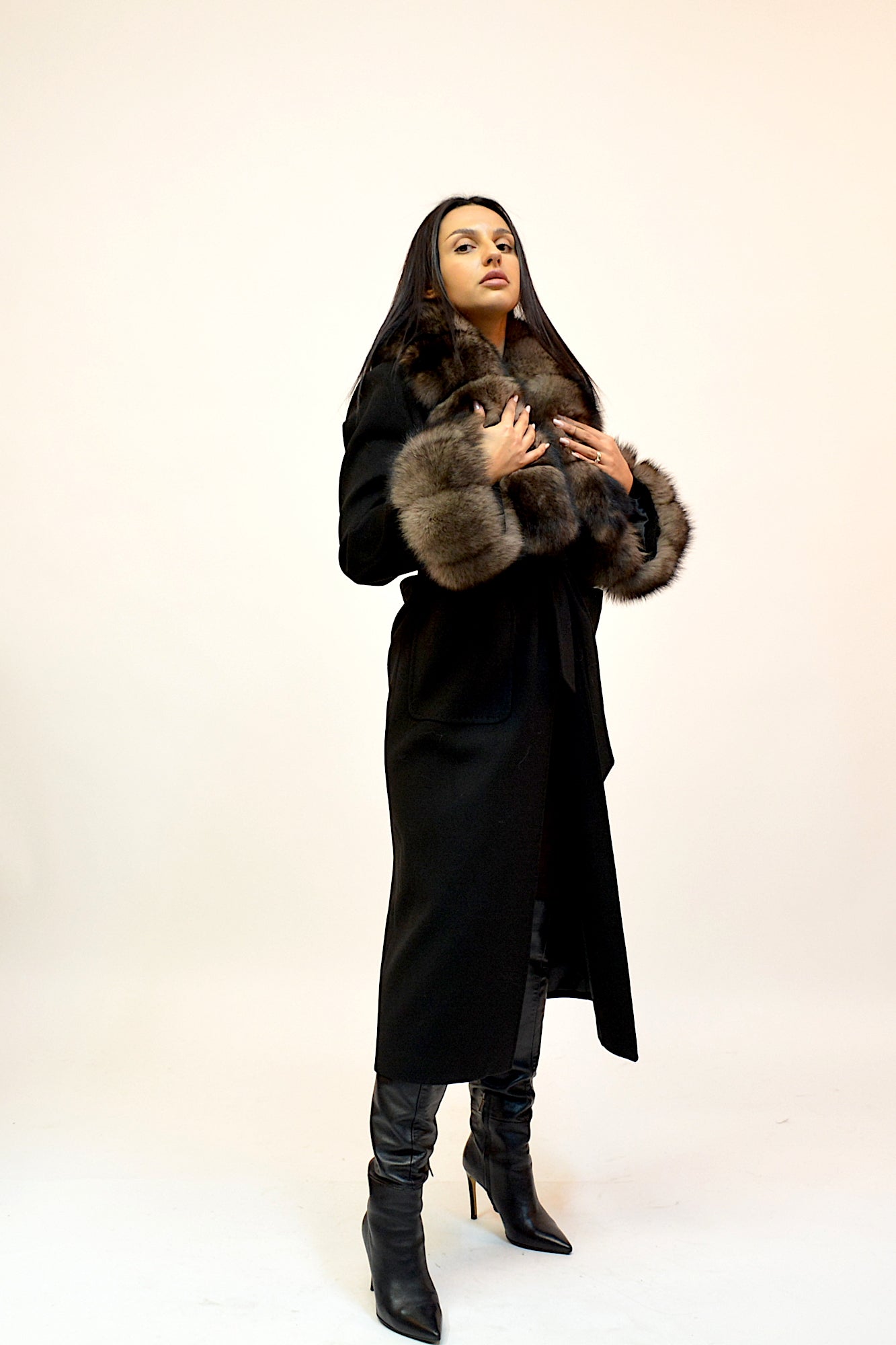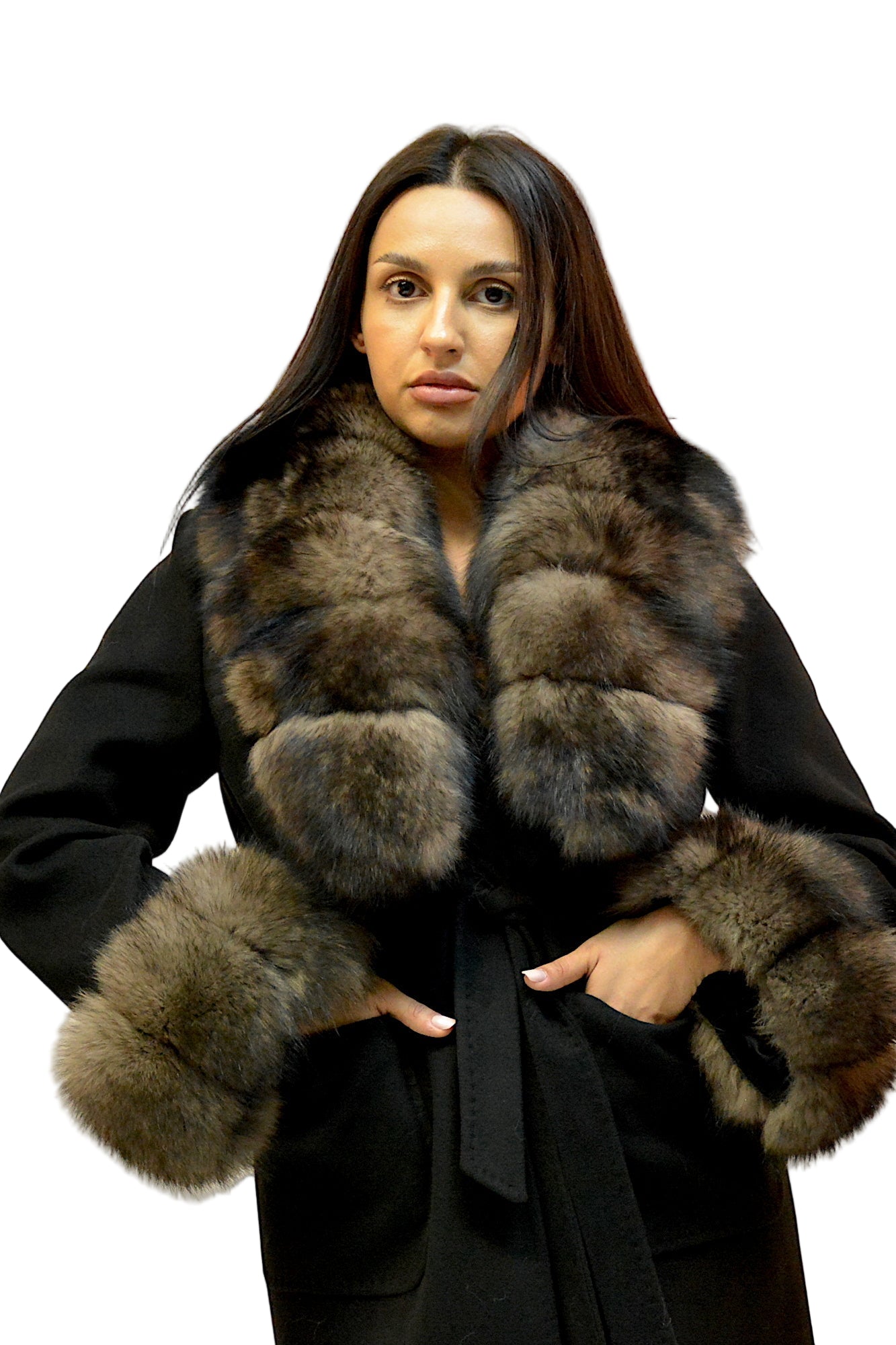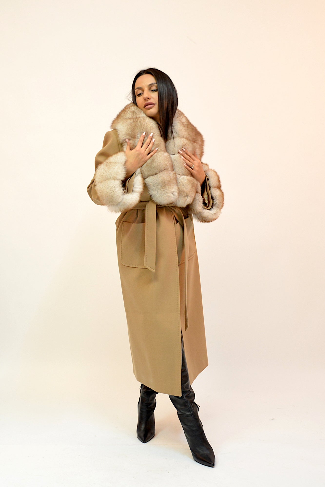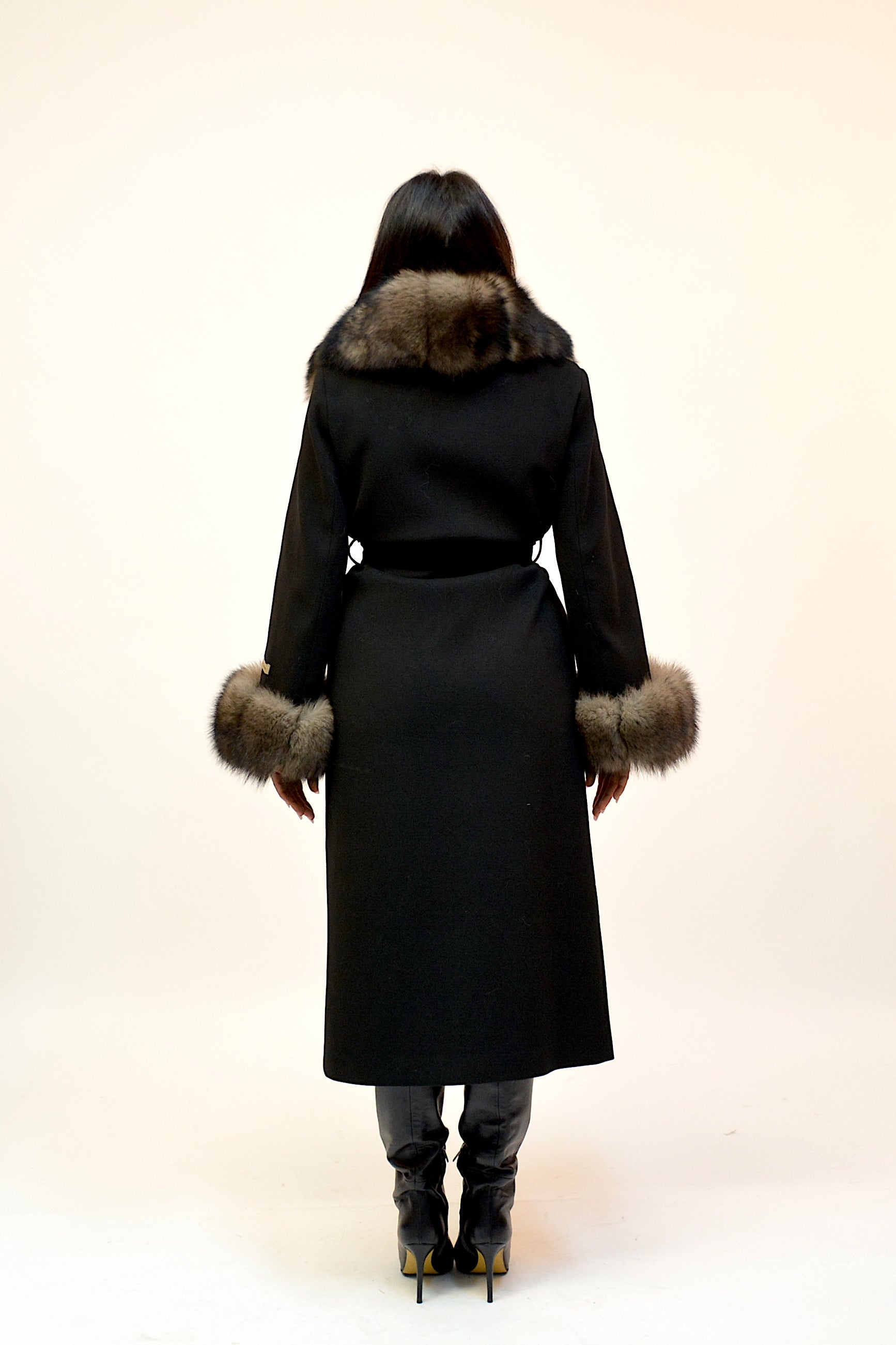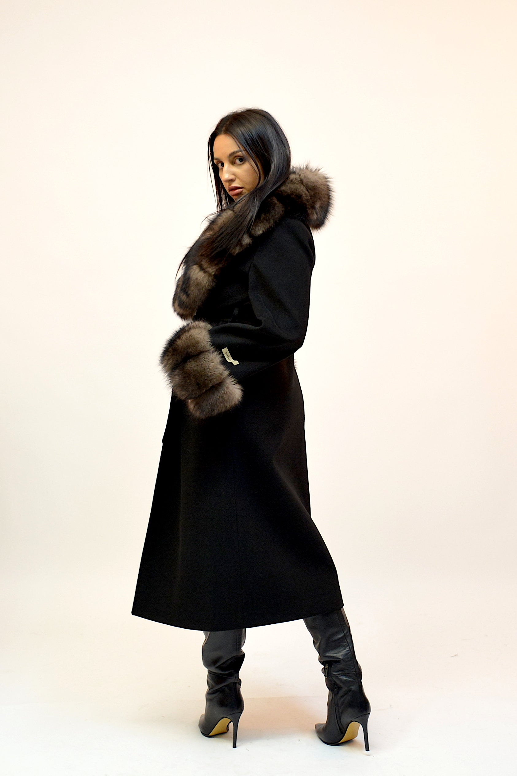 Palton elegant din premium, cu guler amplu și manșete detașabile din blană naturală de vulpe. Croiul lung și designul rafinat oferă un plus de eleganță și versatilitate, ideal pentru ținutele de sezon.