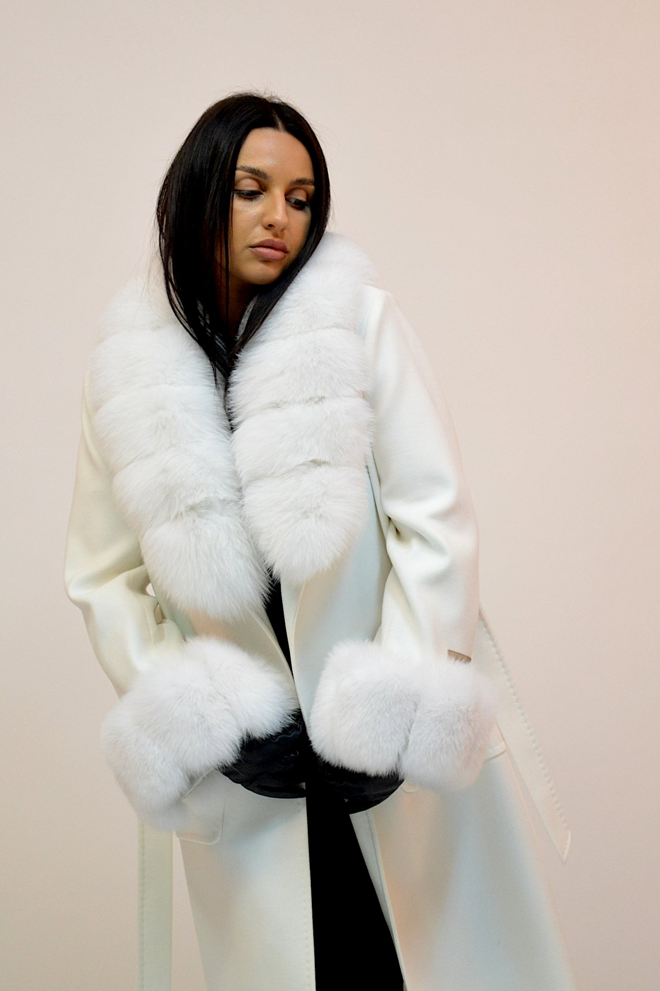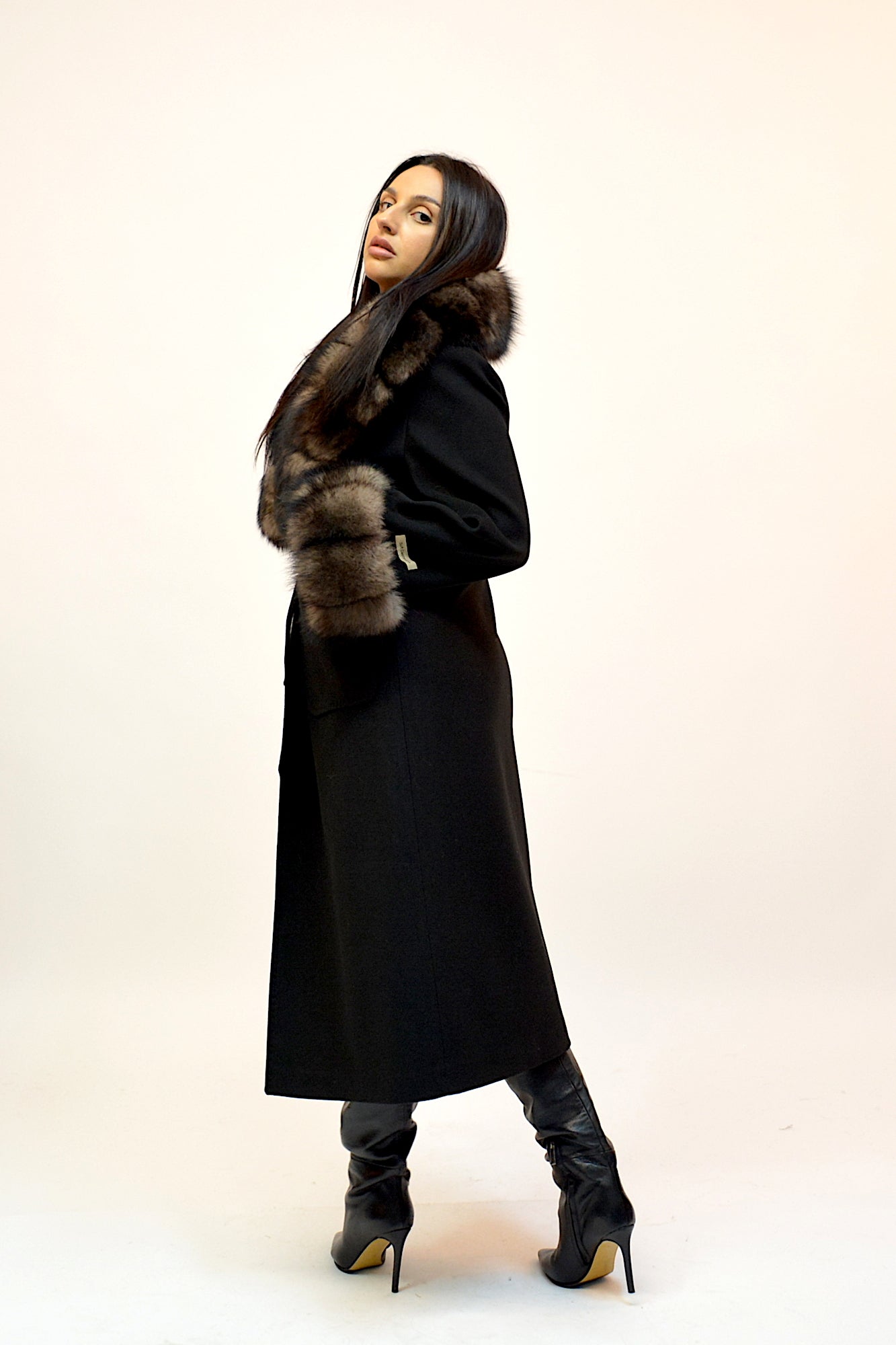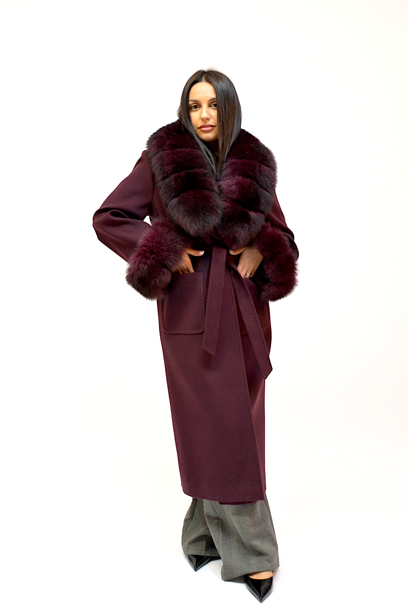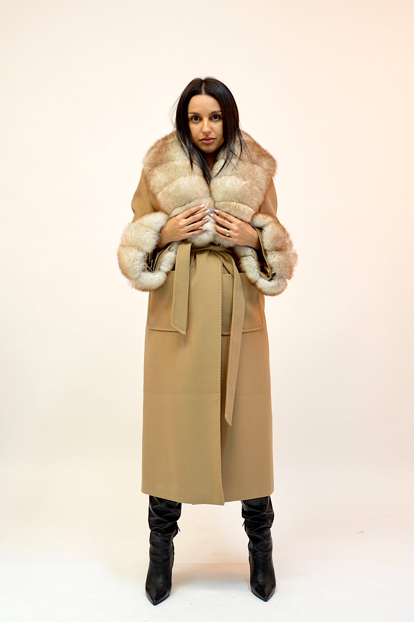 Palton elegant din premium, cu guler amplu și manșete detașabile din blană naturală de vulpe. Croiul lung și designul rafinat oferă un plus de eleganță și versatilitate, ideal pentru ținutele de sezon.