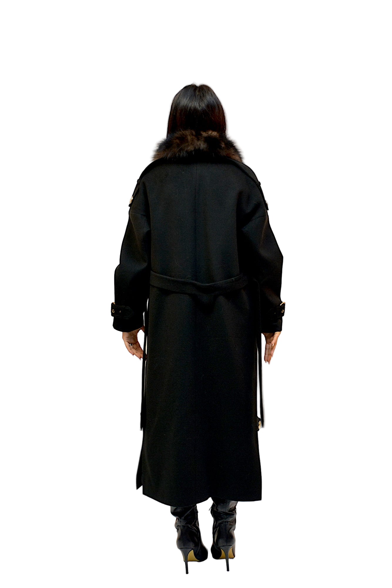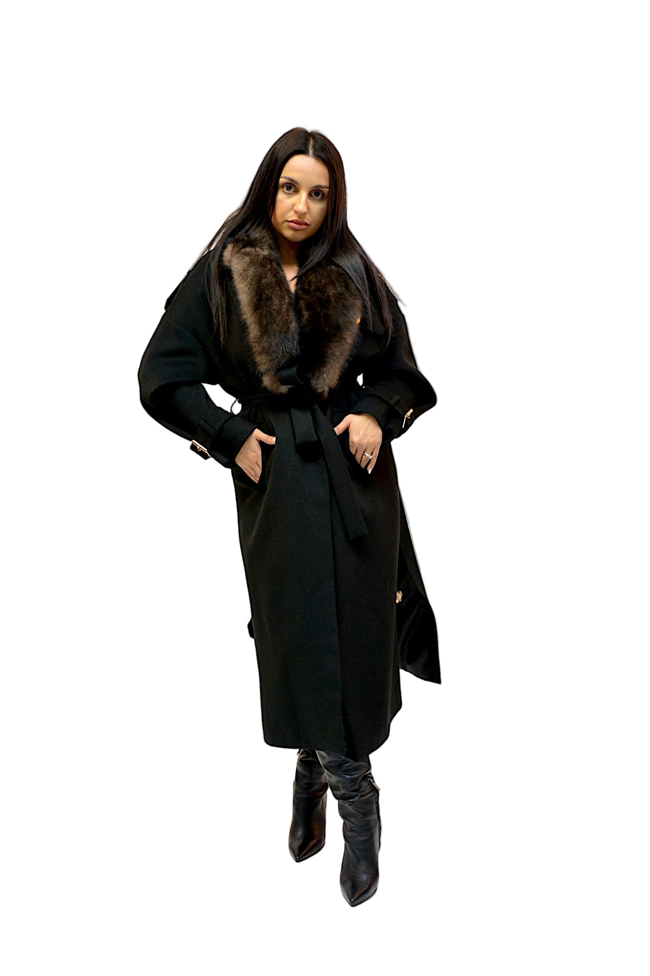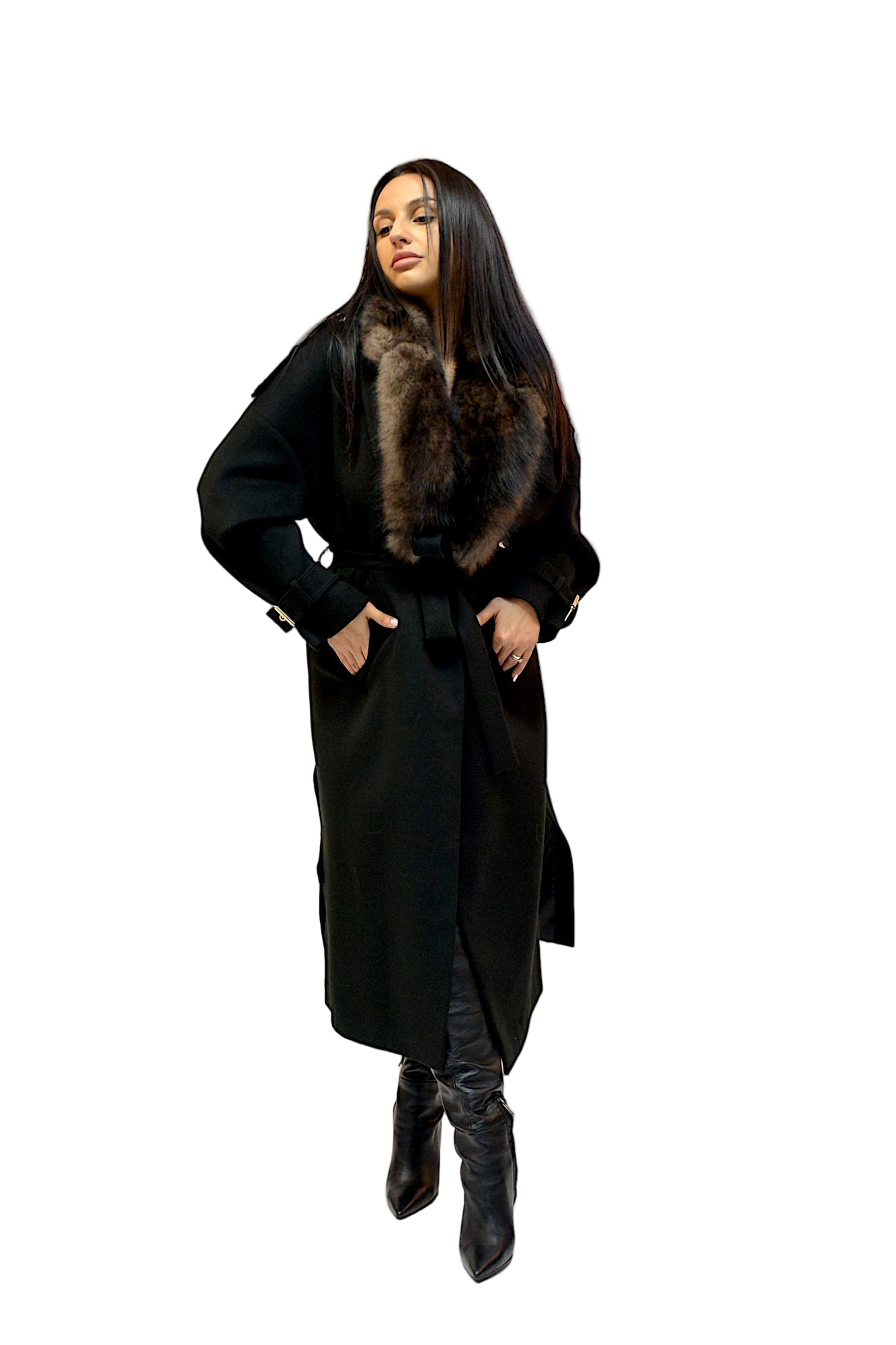 Palton elegant din 33% cashmir, cu croi lung și talie accentuată, completat de un guler generos din blană naturală de vulpe, detașabil pentru versatilitate. O piesă rafinată, ce adaugă un plus de lux și finețe oricărei ținute de sezon.