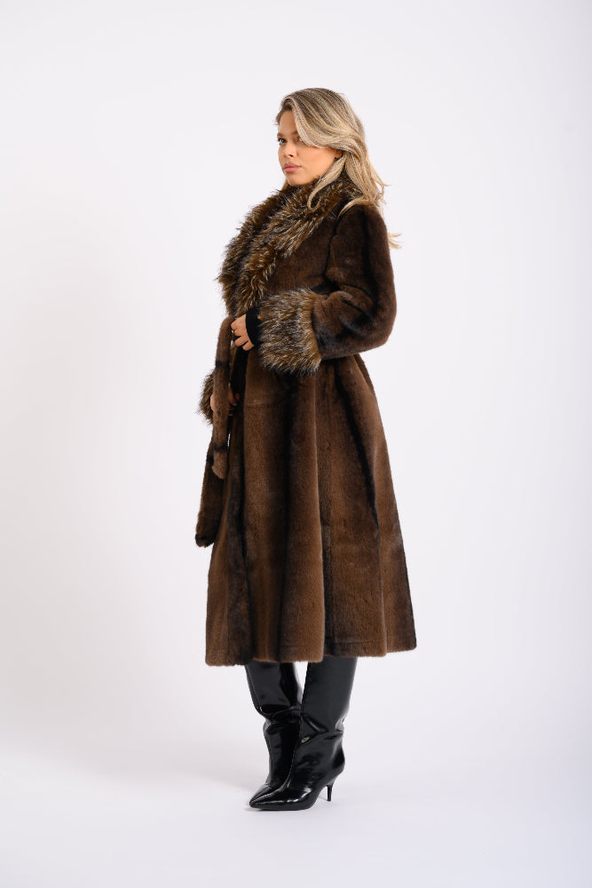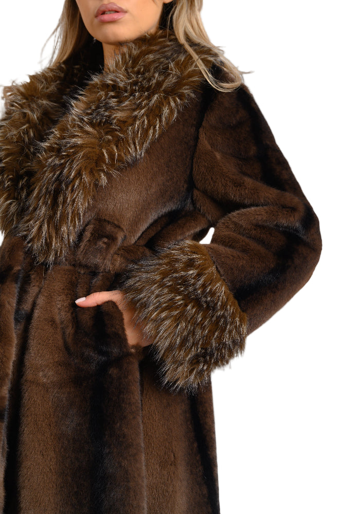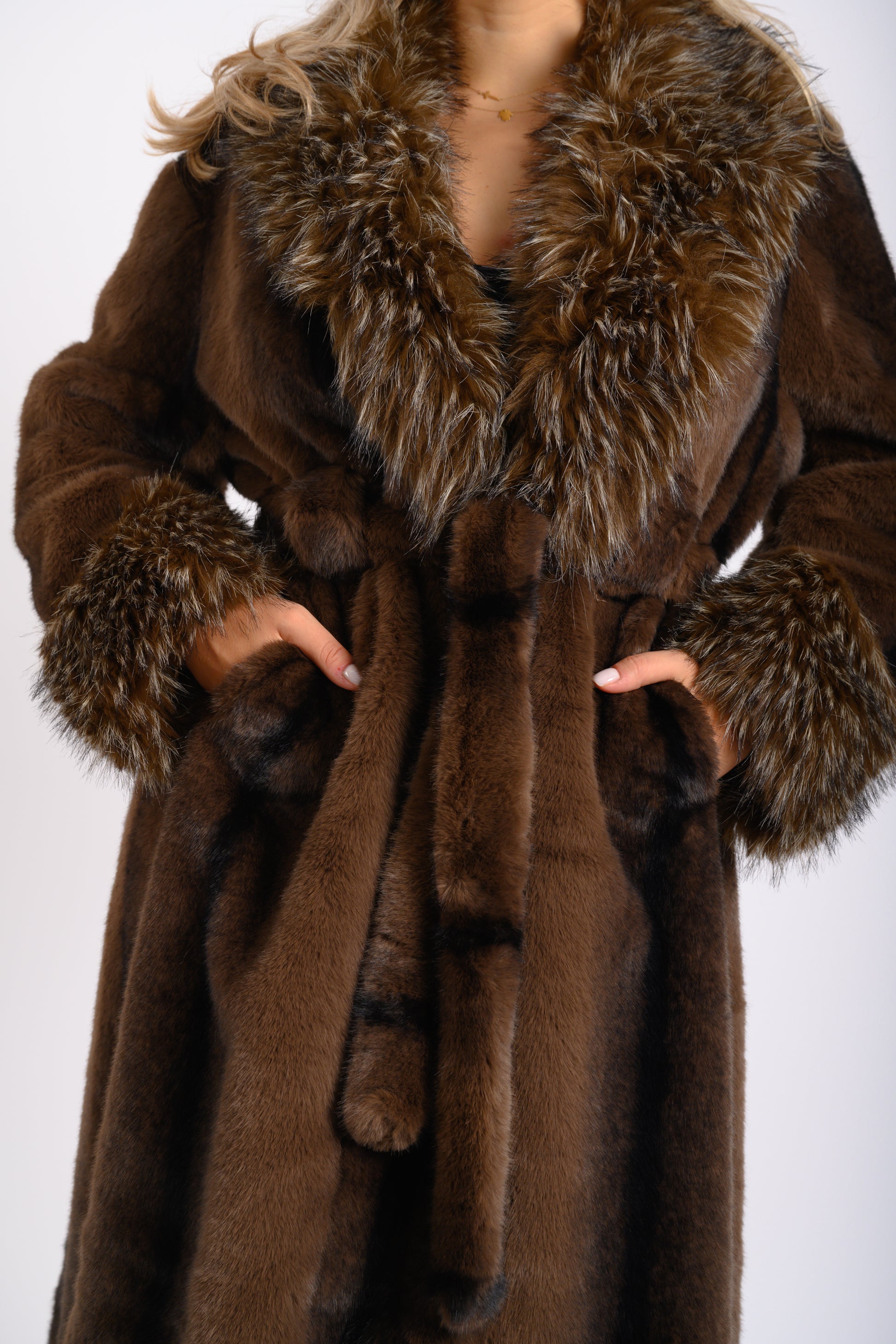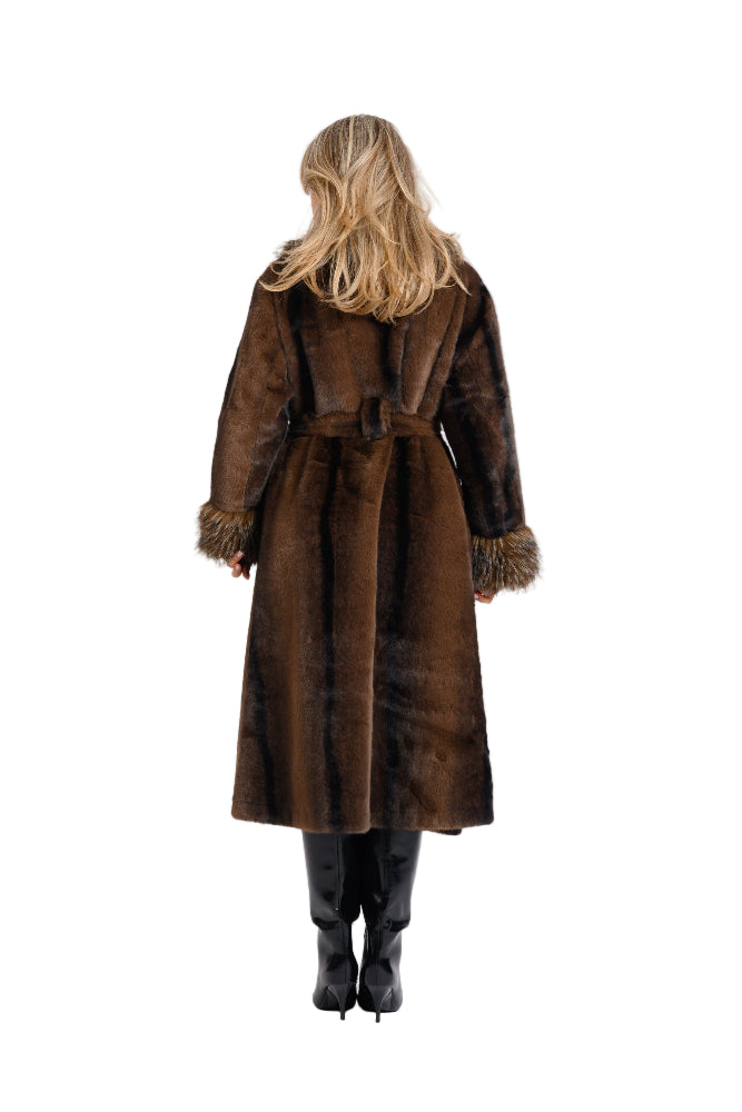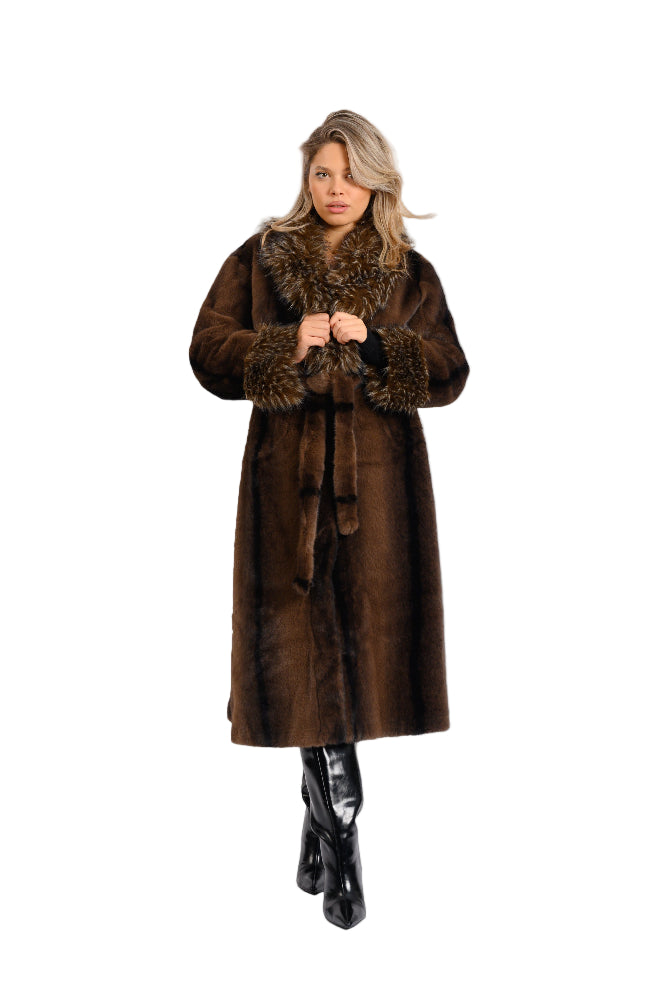 Acest palton lung de blană ecologica se remarcă prin nuanța sa bogată de maro închis. Prezintă detalii luxoase, având guler și manșete voluminoase, cu textură diferită,dintr-o blană ecologica, în tonuri asortate. Haina are o croială clasică și elegantă, ideală pentru un look sofisticat și călduros.