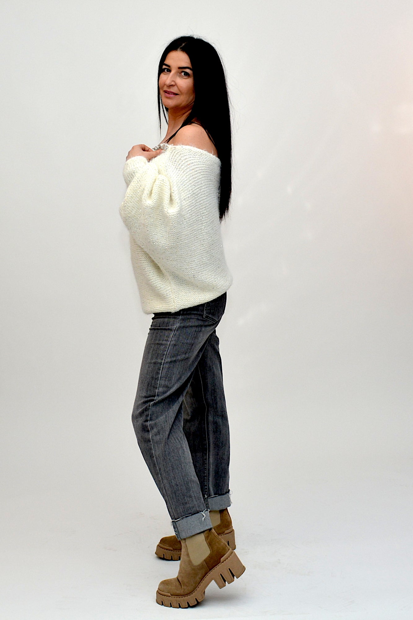 Pulover tricotat moale, cu croi lejer și detalii rafinate de aplicații strălucitoare în partea superioara, un plus pentru o ținută chic sau ofera și fundația dintr-un satin pe partea de umar O piesă elegantă și confortabilă, perfectă pentru a adăuga o notă sofisticată ținută de zi cu zi.